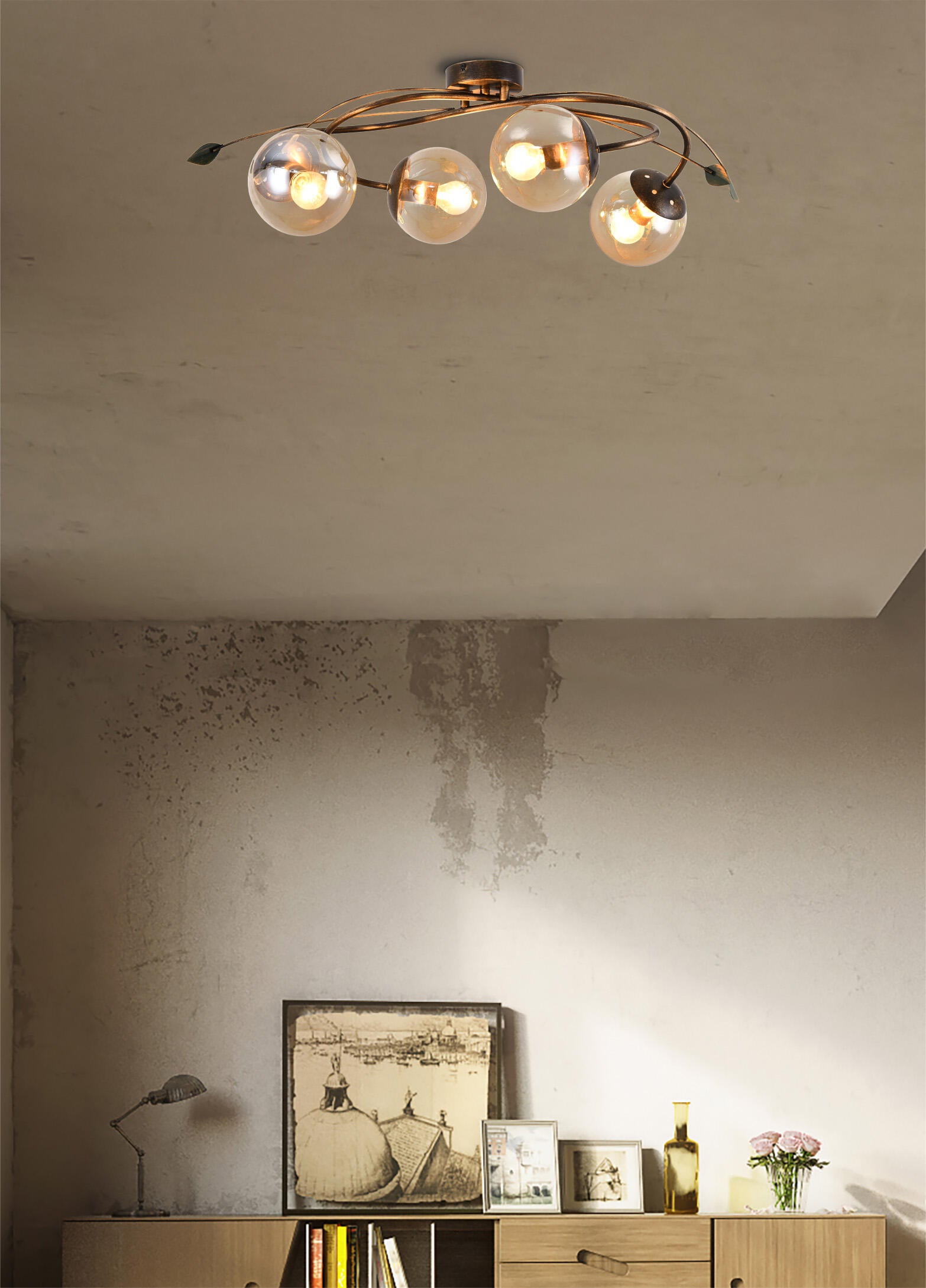 Cecile è la plafoniera a quattro punti luce dalla forma armoniosa, in perfetto stile tradizionale, che saprà valorizzare i tuoi interni. Realizzata in metallo verniciato color marrone con dettagli in oro, questa plafoniera è un perfetto complemento d'arredo. Grazie ai vetri color miele, Cecile illumina il tuo ambiente in maniera accogliente. Con i suoi 71 cm, è perfetta per avere un'illuminazione diffusa sia nella zona giorno, sia nella zona notte. Per creare continuità nell'arredo, sono disponibili lampada da parete a uno e due punti luce, lampada da appoggio e sospensione. Funziona con quattro lampadine E14 da 40W max non incluse.
