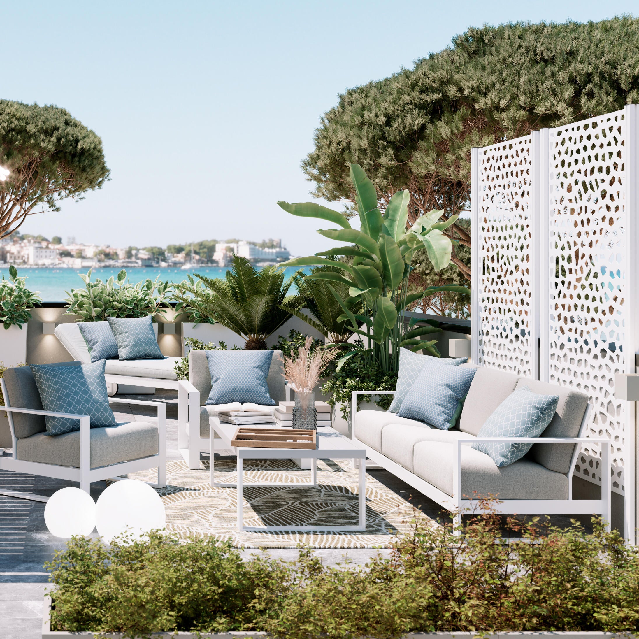 Godetevi un aperitivo con gli amici comodamente seduti sulla poltrona Athena. Una poltrona di design e comoda per le tue calde serate estive Ideale per le tue serate con gli amici, il divano Athena unisce comodità ed eleganza per valorizzare il tuo terrazzo. I suoi cuscini grandi e spessi offrono una seduta ottimale e doneranno un effetto lounge ai tuoi esterni. Con struttura in alluminio e cuscini idrorepellenti sfoderabili, questa poltrona è sinonimo di resistenza e solidità per accompagnarvi anno dopo anno. Qualificato per uso professionale, può essere utilizzato anche sulle terrazze di hotel o bar. Una gamma contemporanea e modulare Realizzate in alluminio spesso, le linee della serie Athena sono dritte e raffinate per un effetto di design e arioso. Questa poltrona con la sua struttura bianca e i cuscini leggeri darà un aspetto moderno ed elegante al vostro esterno. Si completa con i tavolini e gli altri divani della serie per aumentare il numero dei posti e adattare la configurazione a seconda dei vostri ospiti. Tutta la gamma è disponibile anche in grigio antracite. Materiali di facile manutenzione Pratico per l'uso quotidiano, il tuo soggiorno Athena si pulisce facilmente utilizzando un panno umido e un prodotto neutro. I cuscini sono sfoderabili e la loro fodera è lavabile in lavatrice. Per preservarne la qualità, valuta la possibilità di coprire i tuoi mobili da giardino con una copertura Naterial durante lo svernamento. Sono disponibili pezzi di ricambio riparabili per prolungare la vita dei tuoi mobili.