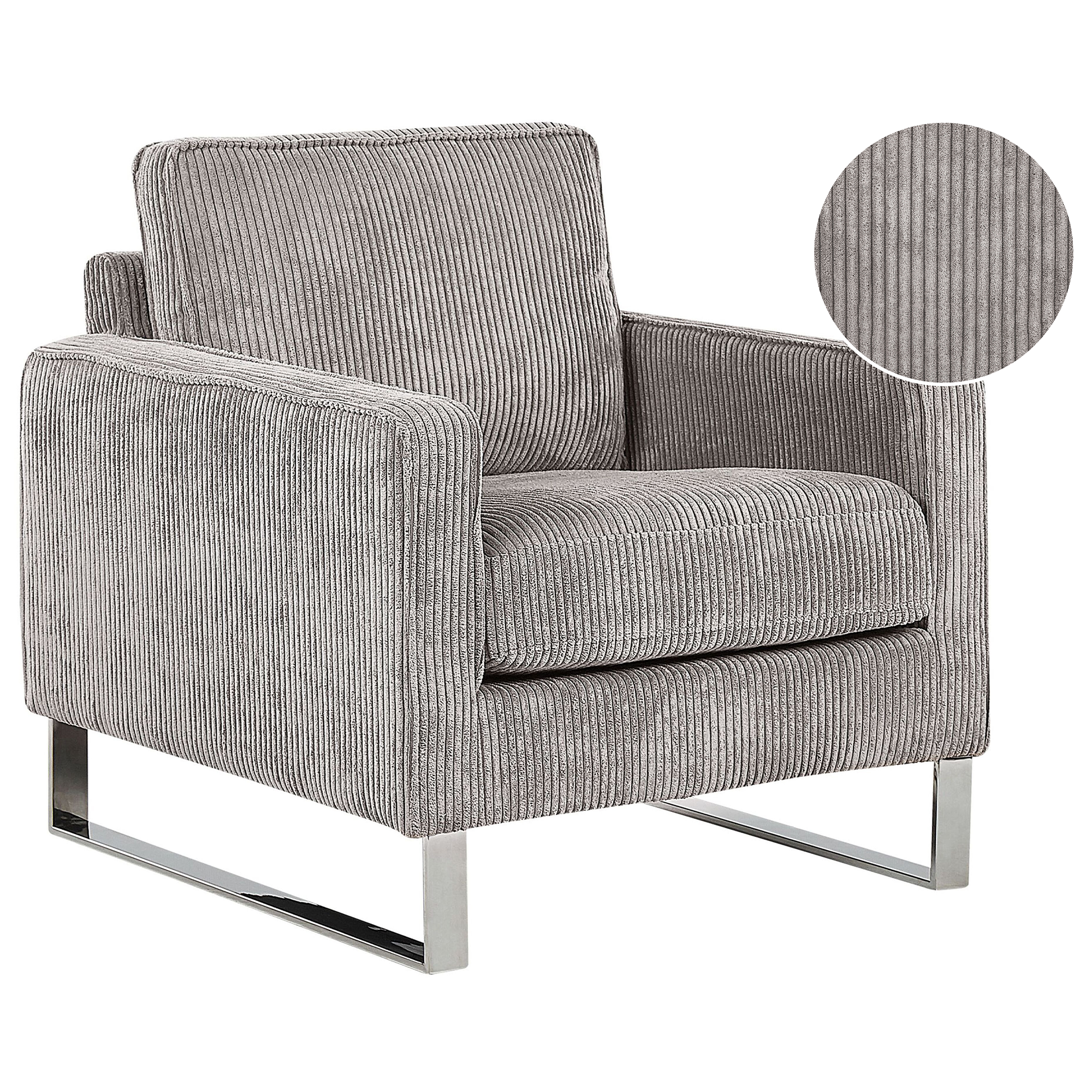 Poltrona moderna in colore grigio. Questa poltrona presenta una struttura robusta, grazie ai suoi piedini in acciaio inossidabile. Con il rivestimento in velluto a coste, la poltrona ha un aspetto unico ed è una bella aggiunta ad interni di ispirazione retrò. Dato il suo design pulito, la poltrona si adatta perfettamente a ogni soggiorno, camera da letto in quanto garantirà comodi posti a sedere per te e i tuoi ospiti.