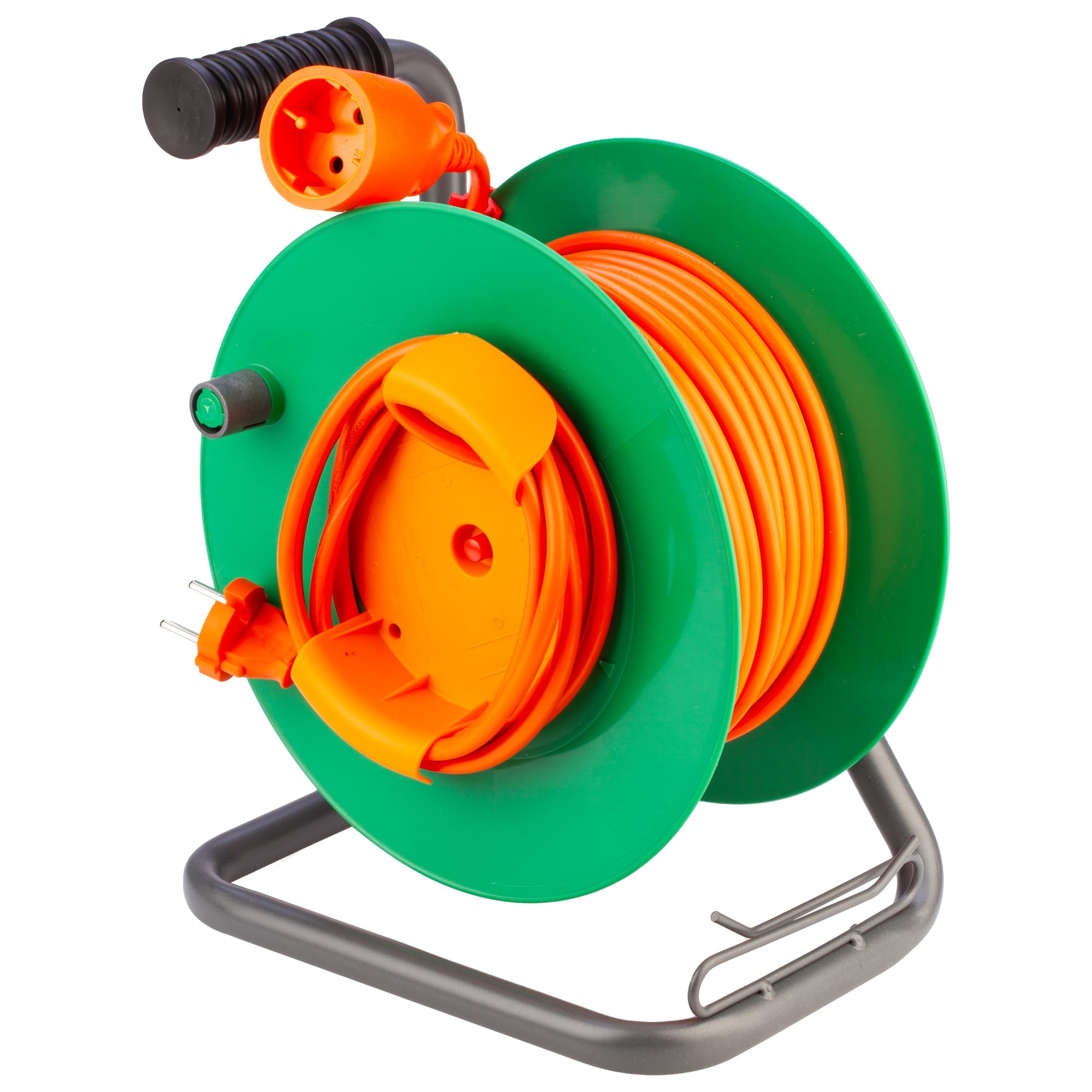 AVVOLGICAVO 230 V~ SERIE “MINI” PER TOSAERBA O SIMILARI CON 25 M DI CAVO H05VV-F 2 X 1,5 MM², SPINA 16 A 2P+T, PRESA MOBILE 16 A 2P+T (STANDARD TEDESCO CON TERRA LATERALE), DISGIUNTORE TERMICO. CAVALLETTO DI SUPPORTO IN ACCIAIO ZINCATO. BOBINA PORTACAVO IN TECNOPOLIMERO. QUESTO AVVOLGICAVO È IDEALE PER COLLEGARE TUTTI GLI APPARECCHI PER LA CURA DEL GIARDINO. COME PREVISTO DALLA NORMATIVA EUROPEA PER LA SICUREZZA DEI CONSUMATORI IL PRODOTTO È DOTATO DI DISGIUNTORE TERMICO PER LA PROTEZIONE DEL CAVO DAL PERICOLO DI INCENDIO. IN CASO DI SOVRARISCALDAMENTO IL DISGIUNTORE INTERROMPE L’ALIMENTAZIONE ALLE PRESE. PER RIPRISTINARLA È SUFFICIENTE PREMERE IL PULSANTE DEDICATO.