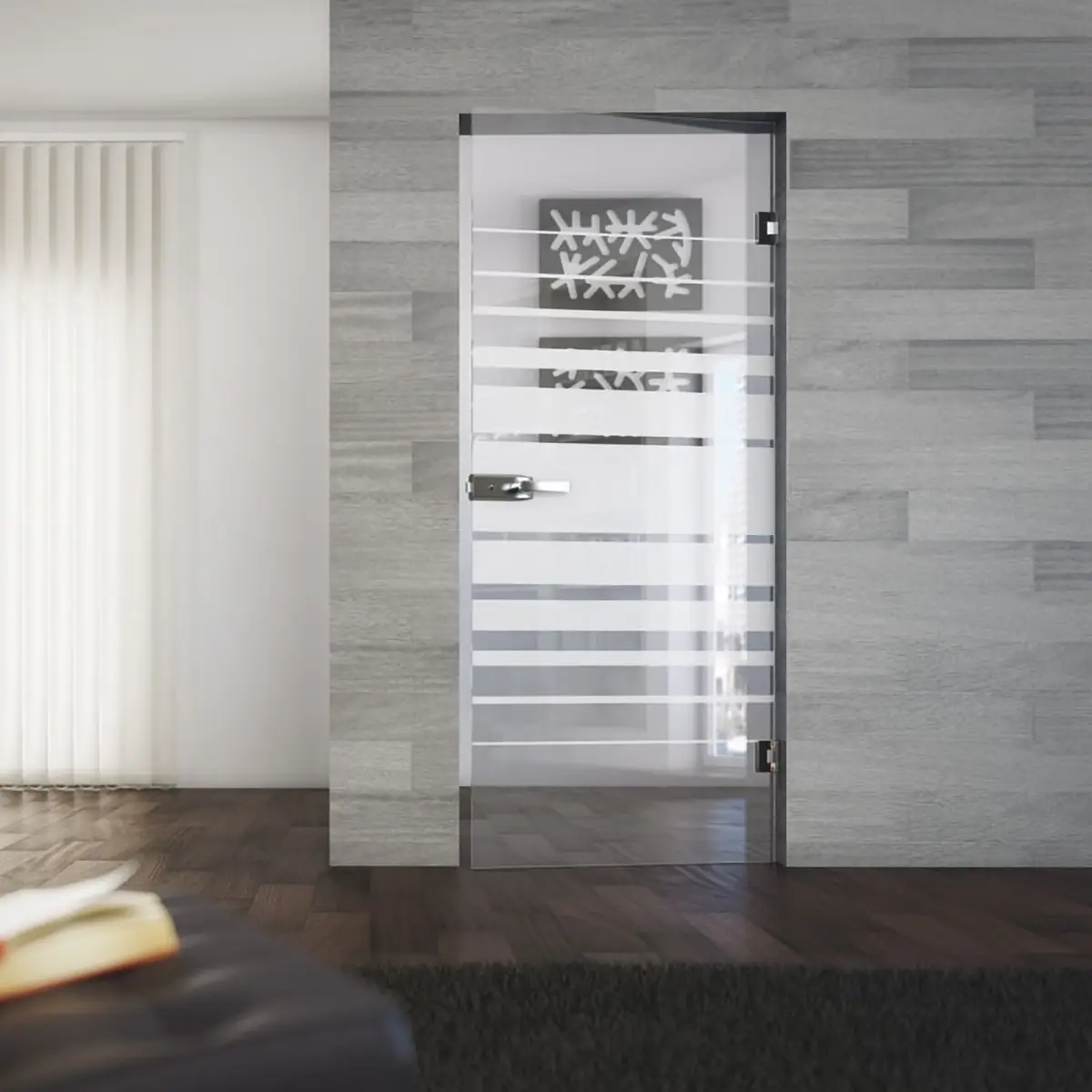 Porta a battente in cristallo con apertura reversibile, finitura sabbiata, serratura meccanica e cerniera cerniere in acciaio spazzolato. Il telaio è realizzato in alluminio. La porta con anta a battente è l'apertura più comune, facile e pratica da utilizzare. Maniglia inclusa. Ideale per casa.