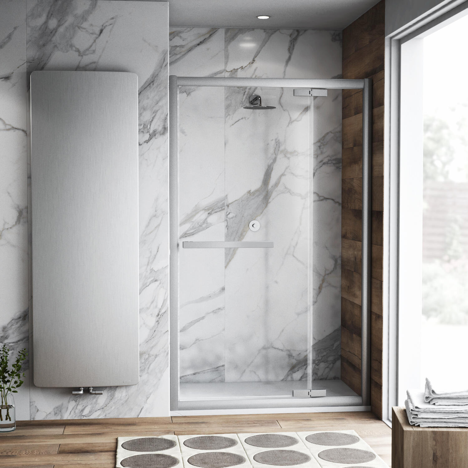 Porta doccia Namara con apertura battente, larghezza 130 cm, altezza 195 cm. Profilo argento con finitura del vetro trasparente.