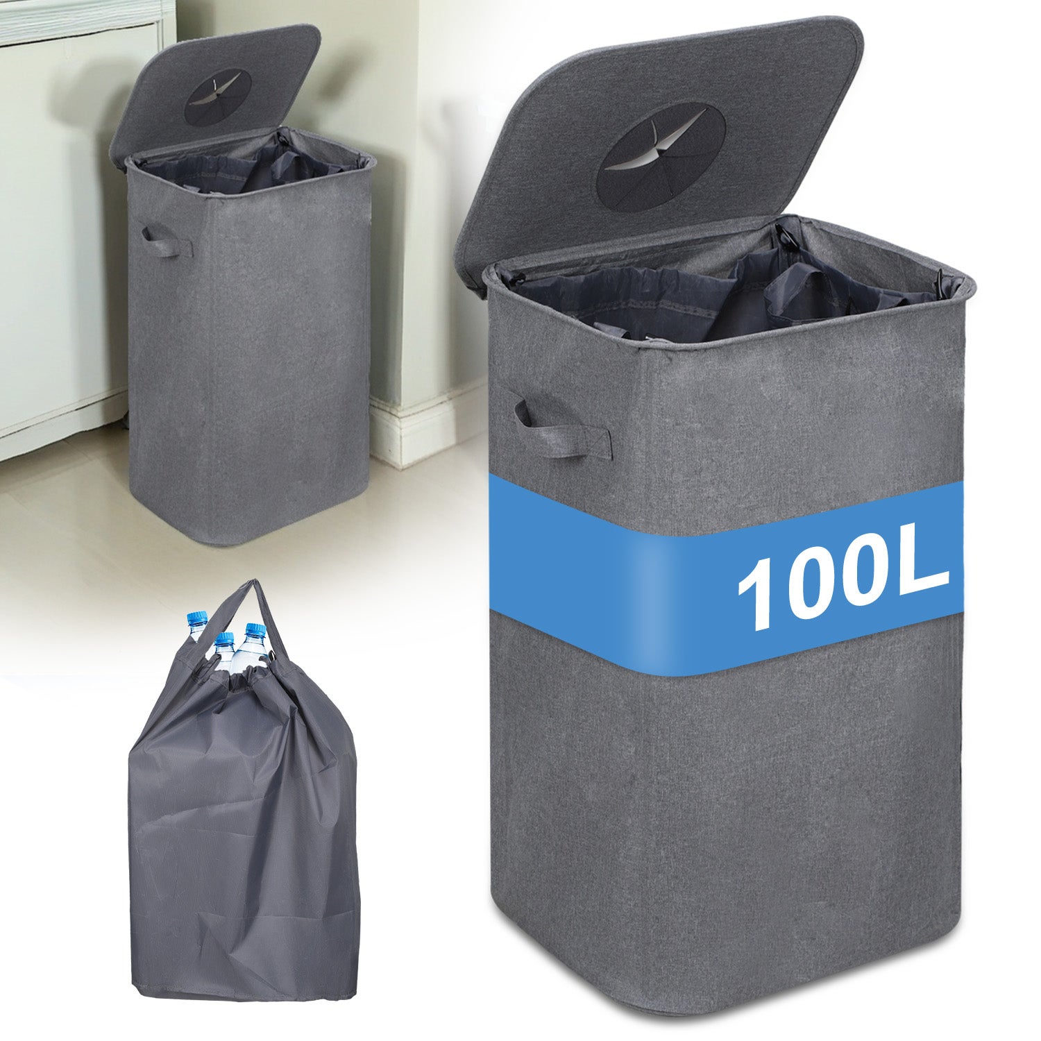 Poubelle Recyclage 100L,Poubelle Avec 2 Sacs De Transport,Stockage Des Bouteilles Consignées Gris