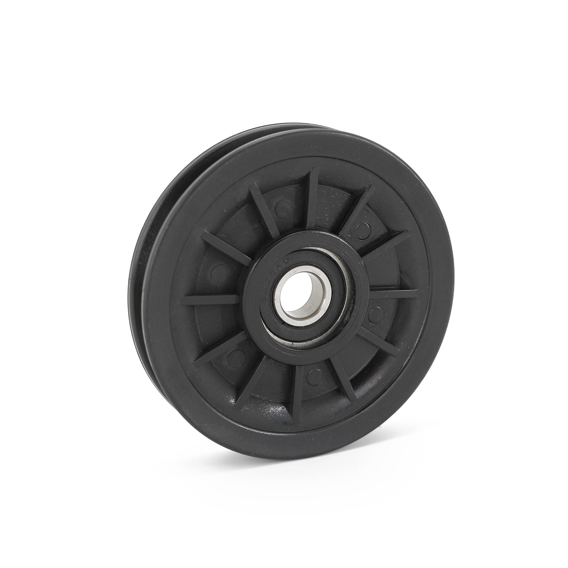 Carrucola in poliammide nera Ø esterno 90 mm. - Ø cuscinetto 15 mm. Carico utile 100 Kg. Ideale per porte basculanti (garage) ed attrezzature da palestra