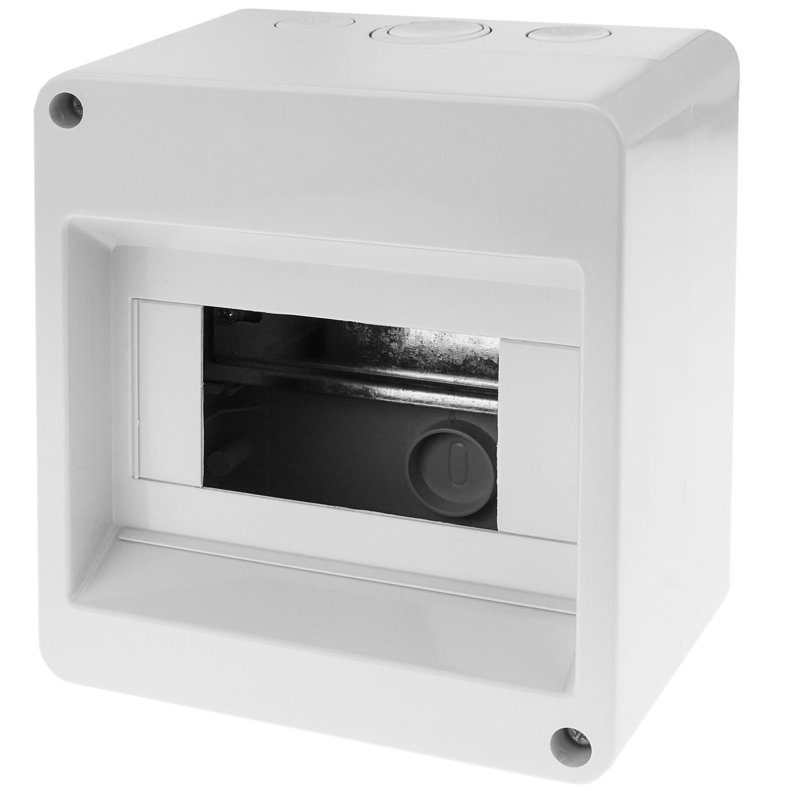 Scatola di distribuzione da superficie in plastica ABS per automazioni elettriche. Quadro elettrico resistente che permette il montaggio di moduli standard larghi 18mm su guida DIN. Quadro di distribuzione che mantiene la struttura elettrica di casa, ufficio, officina, ecc. organizzato e protetto.