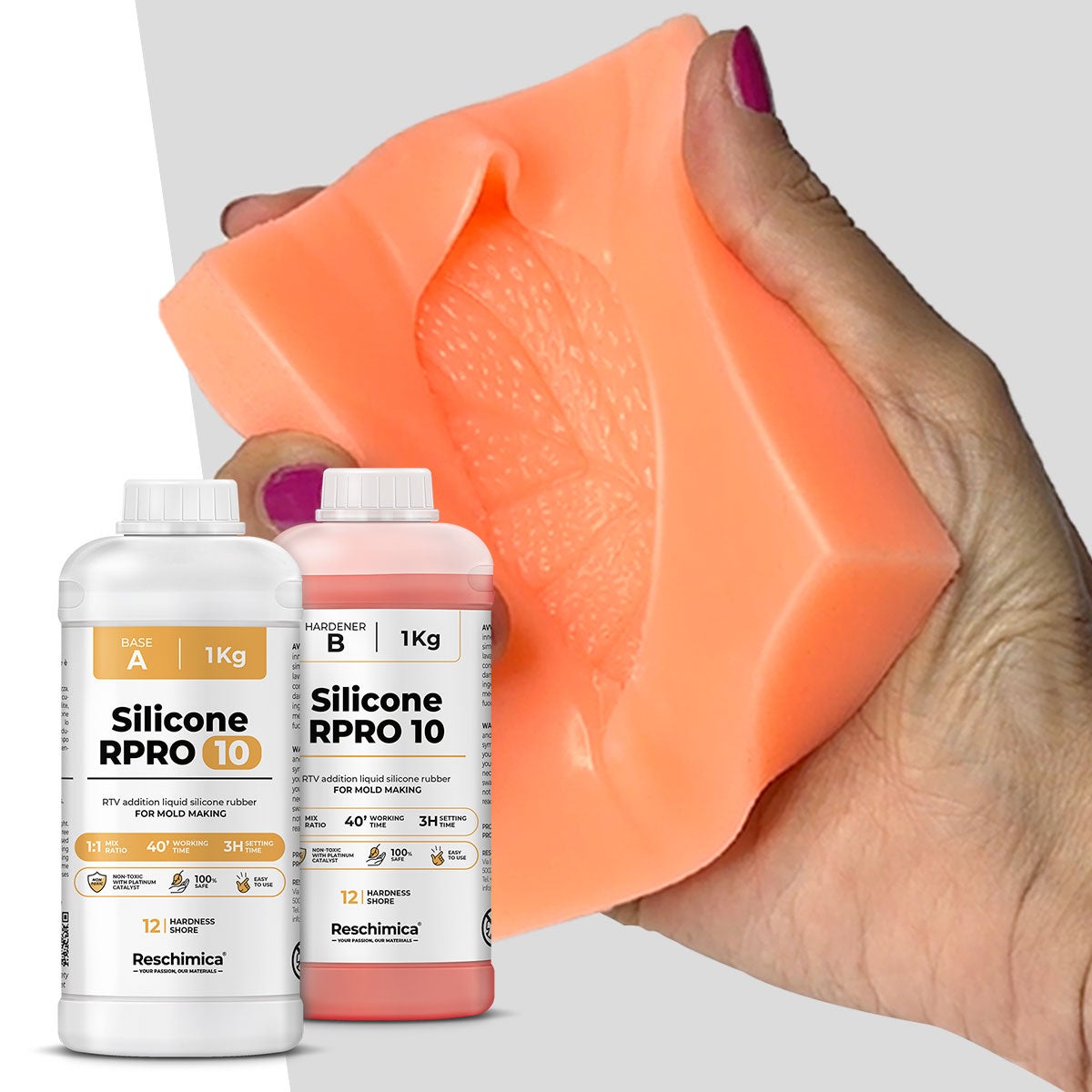 La R PRO 10 Reschimica è una gomma siliconica morbida bicomponente per colata, ideale per chi desidera creare stampi dettagliati e complessi con risultati professionali e duraturi. Si tratta di un silicone elastico 1:1 ad addizione, composto da una base e da un catalizzatore che, una volta miscelati in parti uguali, danno vita a un materiale fluido, resistente e di eccezionale qualità. Inodore e priva di sostanze tossiche, questa gomma soft mold è perfetta sia per un uso professionale che per progetti di modellismo o fai da te artistico. Grazie al suo basso grado di durezza (12 ShoreA), la R PRO 10 permette di realizzare stampi morbidi e flessibili, capaci di catturare ogni minimo dettaglio anche in presenza di sottosquadri o forme complesse. A differenza dei siliconi più rigidi, questa gomma siliconica per sottosquadri evita rotture durante la fase di sformatura e garantisce un distacco pulito e sicuro, senza compromettere la precisione del modello originale. La sua eccellente elasticità e resistenza alla lacerazione rendono possibile un utilizzo ripetuto degli stampi, mantenendo la qualità costante nel tempo. Il silicone per stampi dettagliati R PRO 10 è estremamente fluido e facile da miscelare, non necessita di degasazione sottovuoto e offre un tempo di lavorazione di circa 45 minuti con indurimento completo in 3 ore. Una volta catalizzata, la gomma presenta una stabilità dimensionale perfetta, con ritiro lineare pari a 0%, il che significa che lo stampo non si deforma né si restringe, nemmeno dopo numerose colate. La gomma R PRO 10 stampi è compatibile con una vasta gamma di materiali come resine epossidiche, poliuretaniche, gesso, cera o cemento, risultando ideale per applicazioni nel modellismo, nella prototipazione, nella scenografia, nell’arte e nella decorazione. Il prodotto si distingue anche per la sua facilità d’uso: basta miscelare i due componenti (A e B) in rapporto 1:1 per ottenere un composto pronto all’uso, perfettamente uniforme e privo di bolle. Scegliere R PRO 10 Reschimica significa affidarsi a una gomma siliconica professionale e flessibile, apprezzata da artigiani, artisti e designer per la sua versatilità e precisione. Le recensioni R PRO 10 Reschimica evidenziano la qualità costruttiva, la durata degli stampi e la capacità di catturare i dettagli più fini. Rispetto alla R PRO 20, questa versione offre una maggiore morbidezza ed elasticità, ideale per sottosquadri profondi o modelli complessi. Con R PRO 10, ogni creazione prende forma in modo impeccabile: una gomma sicura, performante e 100% Made in Italy.