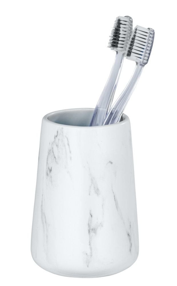 L'elegante vetro per i denti delle spazzole della serie di accessori da bagno adrada è realizzato in ceramica di alta qualità. Lo speciale design del marmo conferisce ad ogni bagno un'atmosfera speciale che attira tutti gli sguardi. Nell'elegante vetro per gli spazzolini da denti Adrada, i tuoi spazzolini da denti e il dentifricio troveranno un posto sicuro e moderno in qualsiasi bagno e sarà a portata di mano. Quale sarebbe un bicchiere per ogni membro della famiglia? Per accompagnare il bicchiere pratico per spazzolare i denti Wenko, la gamma offre anche il distributore di sapone, il piatto di sapone e il set di servizi igienici abbinati. Materiale: ceramica. Colore: bianco, grigio. Dimensioni: 8,5 x 12 cm