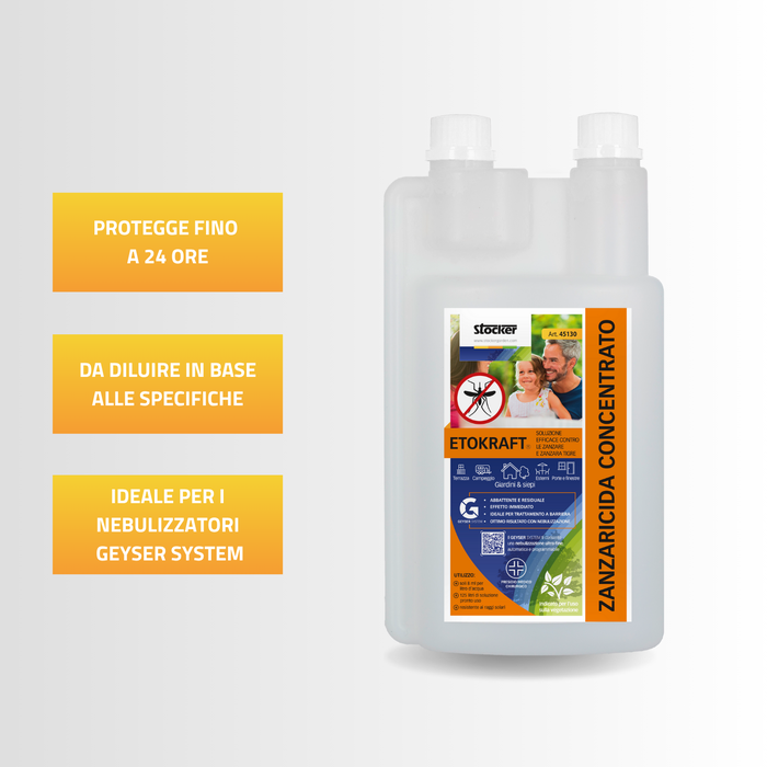 Etokraft è un zanzaricida concentrato a base di Etofenprox, ideale per trattamenti ambientali, anche a barriera. Ha un effetto immediato, resistente ai raggi solari con efficacia fino a 24 ore. È efficace contro la maggior parte degli insetti molesti o dannosi, come zanzara comune, zanzara tigre, mosche e zecche. Ideale per terrazze, campeggi, porte e finestre, è sicuro anche sulla vegetazione di giardini e siepi. Adatto a nebulizzazione ultra fine con nebulizzatori Geyser System. Presidio medico chirurgico.