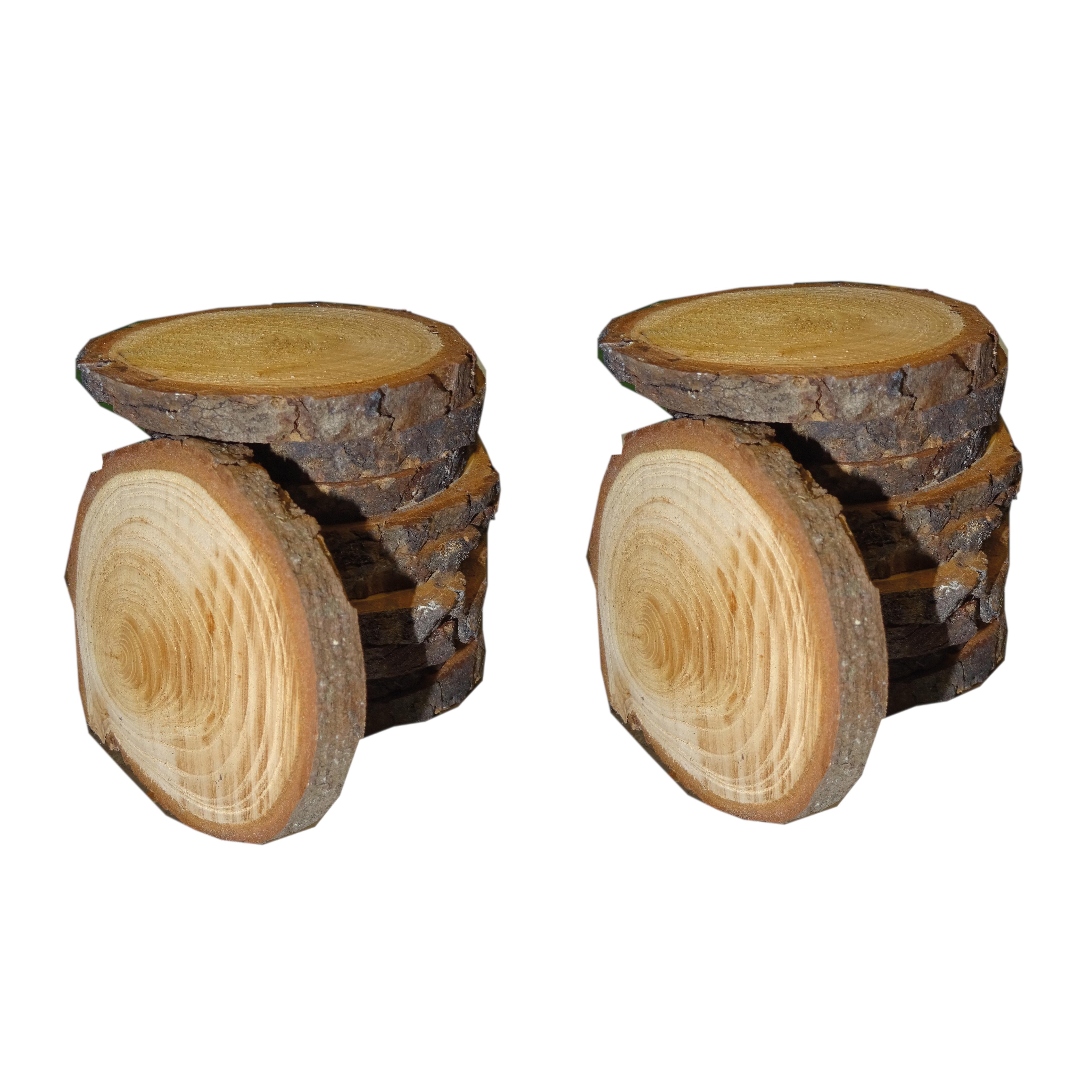 Rondella con corteccia, realizzata in legno massello certificato PEFC, proveniente da foreste gestite in modo responsabile. Utile come sottobicchiere, sottopiatto o per decorare la tavola. Prodotto di dimensioni variabili. Dimensioni: diametro 80/120 mm spessore 10 mm Confezione 20 pezzi.