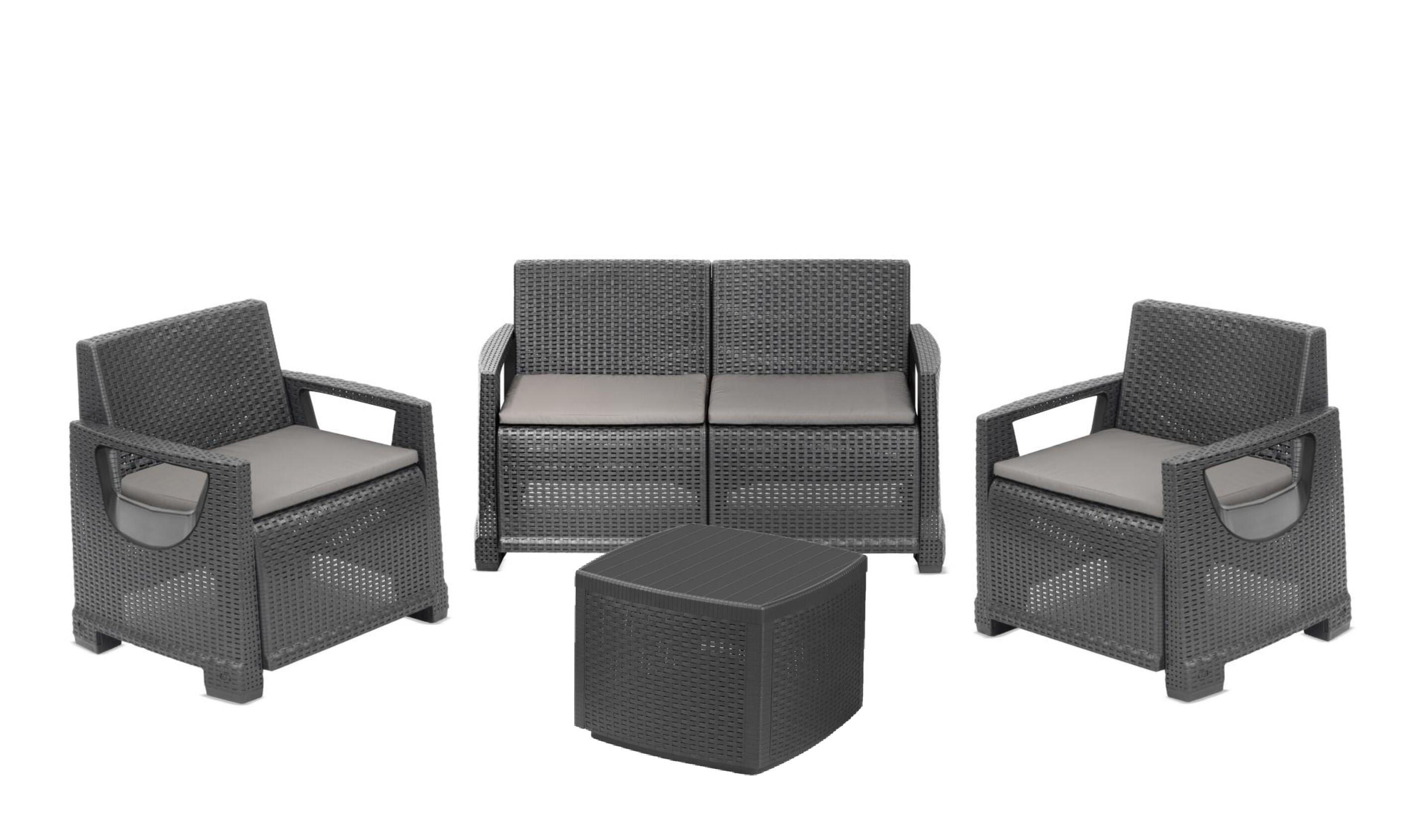 Raffinato coffee set da giardino in resina, progettato per rendere ogni momento all'aperto speciale e conviviale. Questo set include due eleganti poltroncine, un divano 2 posti e un tavolino contenitore. Il tavolino, oltre a offrire un comodo piano d'appoggio, è dotato di un pratico scomparto interno, perfetto per riporre cuscini o altri accessori, mantenendo l'area sempre in ordine e funzionale. Realizzato con materiali resistenti alle intemperie, il set è pensato per resistere agli agenti atmosferici e non richiede manutenzione. Il design moderno e accattivante si integra facilmente in qualsiasi giardino, terrazzo o balcone, aggiungendo un tocco di eleganza e comfort.