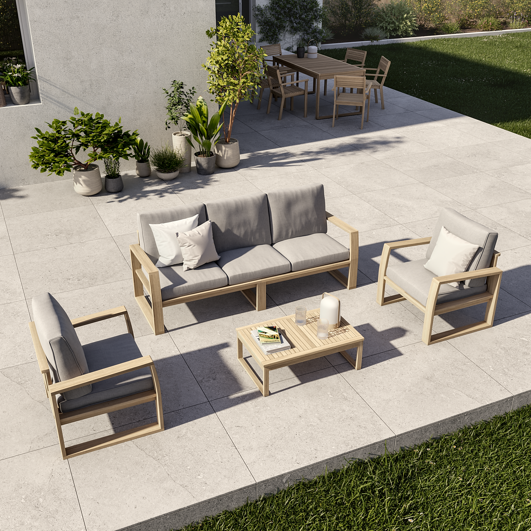 Salotto da giardino composto da un tavolino rettangolare in legno massello di acacia, colore naturale, 1 divano a tre posti e 2 poltrone con struttura e seduta in legno, completi di 10 cuscini sfoderabili realizzati in poliestere. Dimensioni tavolo: 80 x 55 x 28 cm (larghezza x profondità x altezza). La serie Solaris di Naterial è stata progettata per durare nel tempo: il legno di acacia ha un'elevata densità che lo rende molto resistente all'umidità e ai raggi UV, mentre la ferramenta in acciaio zincato ne garantisce resistenza ai colpi e agli attacchi dell'ambiente esterno. Il legno di acacia è riciclabile al 100% e certificato FSC. L'etichetta FSC ne attesta la sua provenienza da foreste gestite in modo sostenibile e responsabile. Per i prodotti della serie Solaris l'imballaggio è ottimizzato per ridurre al minimo l'impatto sull'ambiente. Il cartone e la carta sono stati preferiti in quanto di origine rinnovabile (legno) e sono riciclabili. Le materie plastiche sono presenti solo quando strettamente necessario per imballare e trasportare il prodotto in sicurezza.