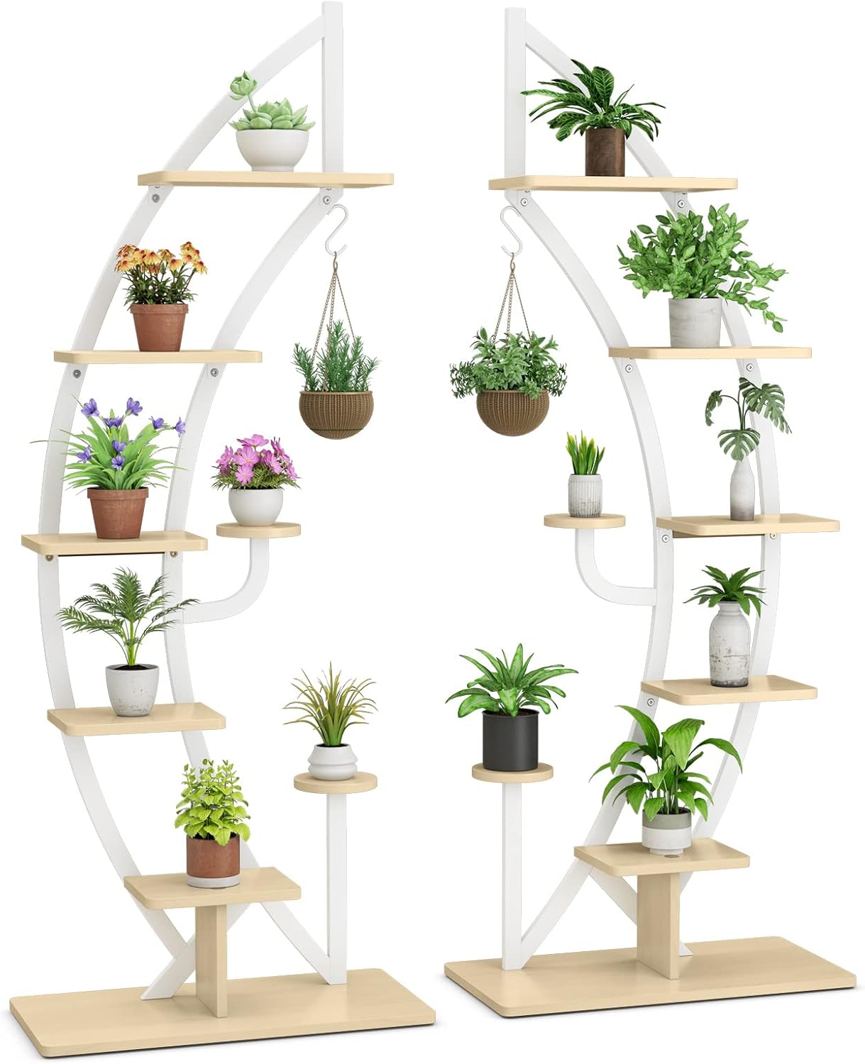Scaffale per Piante a 7 Livelli, Scaffale a Forma di Mezza Luna con Gancio e Dispositivo Antiribaltamento, Porta Piante e Fiori per Soggiorno,