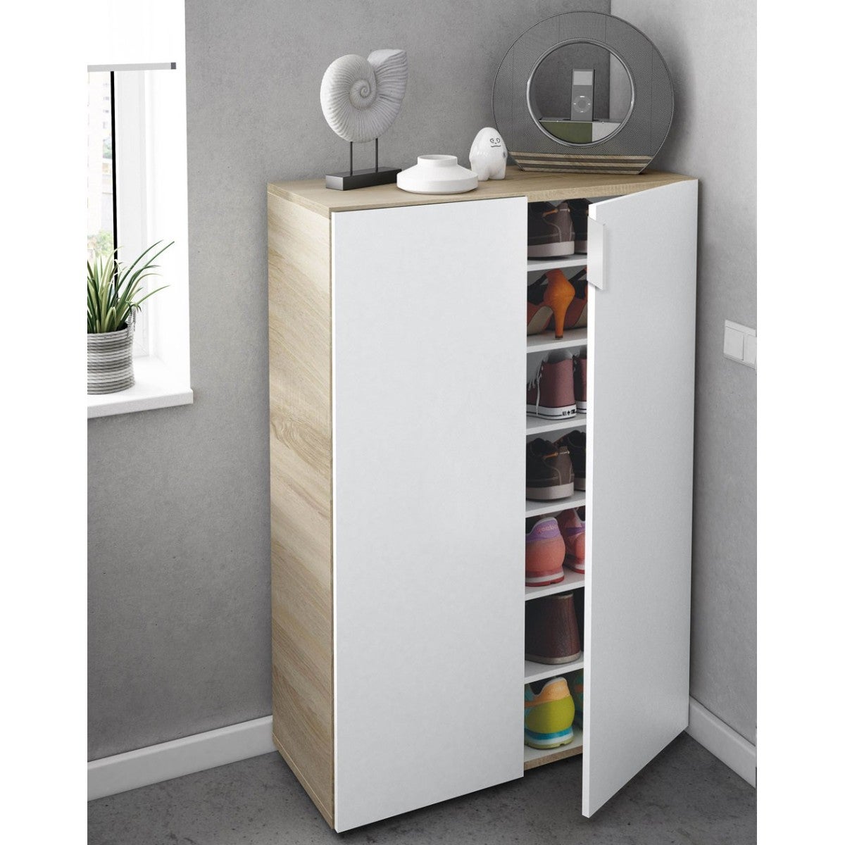 Realizzata in truciolare melaminico con bordi in PVC, la scarpiera è dotata di cerniere metalliche e supporti per ripiani in metallo. I tacchetti in ABS antirumore e antigraffio proteggono il pavimento e garantiscono stabilità. Versatilità e praticità d'uso