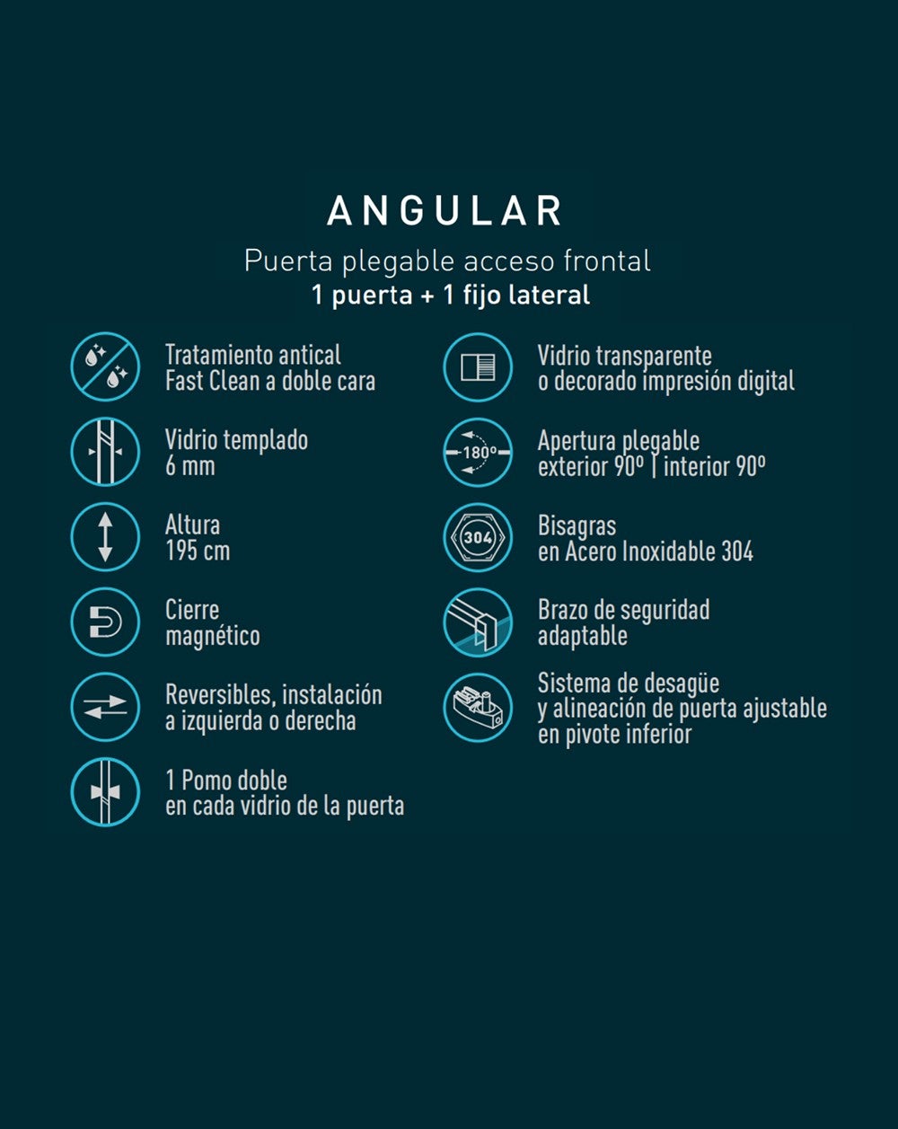 Mampara de ducha frontal de 1 puerta plegabile + 1 cristallo fisso, perfetta per quei bagni che desiderano avere un accesso ampio e comodo al piatto doccia. Questa cabina doccia pieghevole ha un’apertura di 90º verso l’interno e altri 90º verso l’esterno, oltre a un’altezza di 195 cm, vetro temperato di alta sicurezza da 6 mm e trattamento anticalcare. Una volta effettuato l’ordine, ci metteremo in contatto con Lei per conoscere la misura approssimativa del cristallo fisso e il resto della mampara sarà completato con la porta. Questo modello con 1 porta pieghevole + 1 fisso ha la porta della cabina doccia con chiusura magnetica ed è reversibile, ovvero può essere installata sia a destra che a sinistra. Inoltre, la porta dispone di 2 pomelli doppi, su ogni vetro della porta, per consentire una migliore maneggevolezza sia in apertura che in chiusura. Questa cabina doccia ha gamme adattabili.