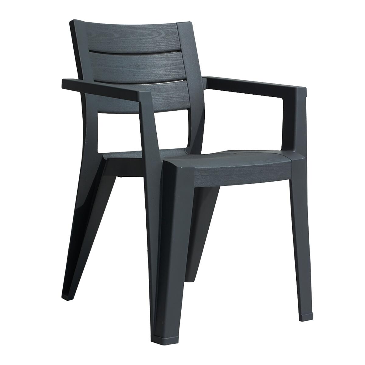 Sedia impilabile da giardino della serie JULIE di Keter, realizzata in polipropilene. Finitura effetto legno spazzolato. Incorpora i braccioli per favorire il comfort nelle lunghe giornate all'esterno. Dal design moderno e semplice, la sedia porterà una ventata di aria fresca in qualunque spazio. Colore antracite. Dimensioni: 61.5 x 58.5 x 79 cm (Larghezza x Profondità x Altezza)