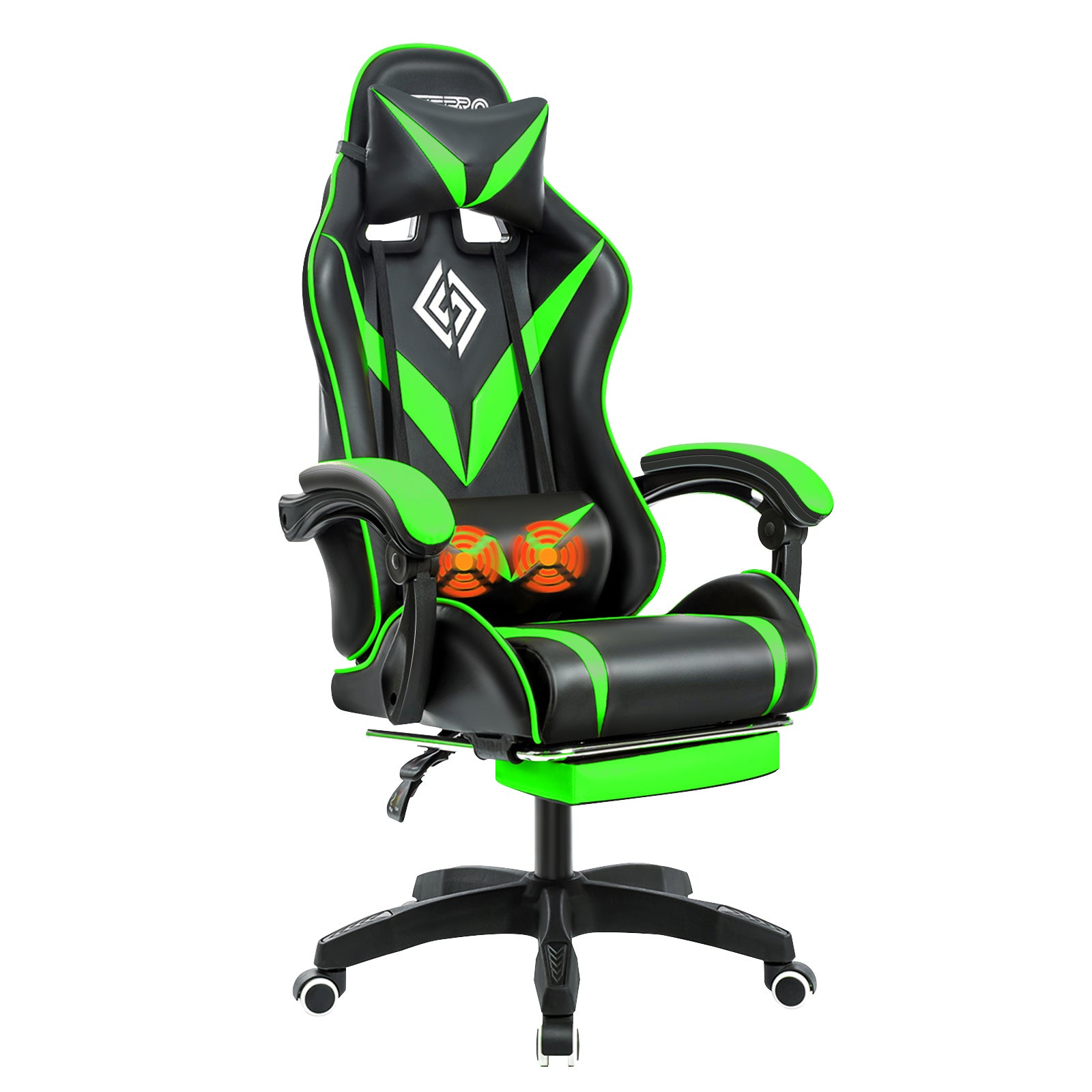 Sedia da gioco ergonomica massaggiante Sedia da ufficio regolabile in altezza con cuscino lombare, poggiatesta, poggiapiedi - Verde e nero