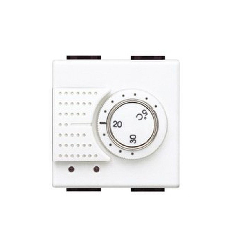 Termostato standard con interruttore. Con interruttore estate/inverno incorporato. Uscita con relè e contatto C-NO 2A 250V. Alimentazione 230 V. 2 moduli. Bianco. Livinglight.