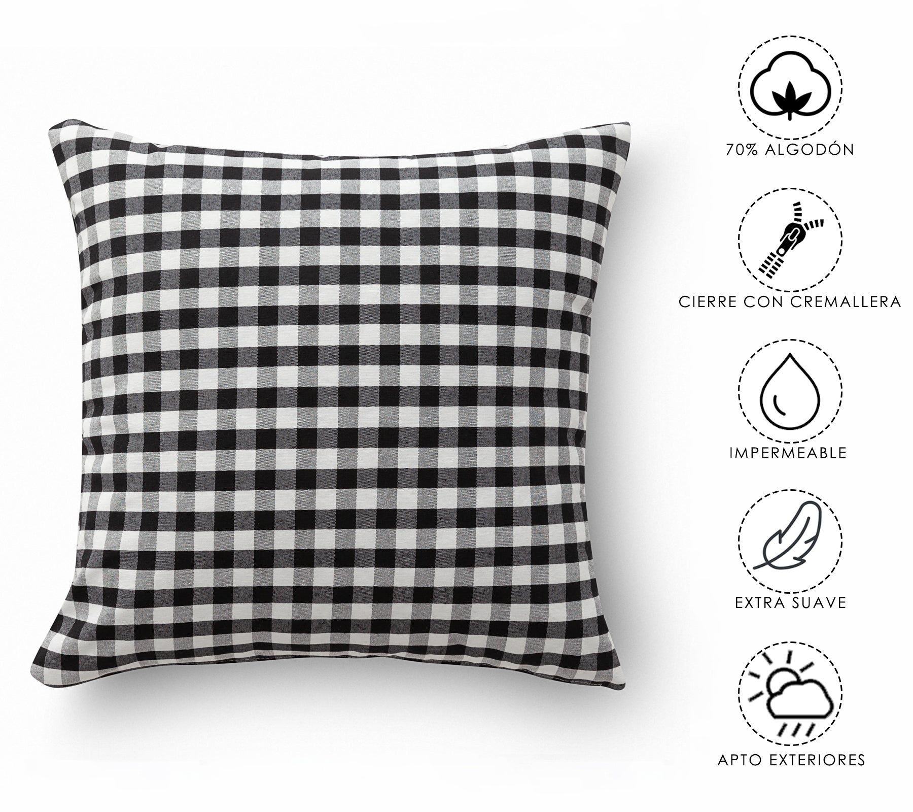 Due federe per cuscini a quadretti, ciascuna delle quali misura 45x45 centimetri, fondono stile e praticità. Sono realizzate con una miscela di materiali di alta qualità, 70% cotone e 30% poliestere, garantendo morbidezza e durata intrinseche al cotone, insieme alla resistenza e facilità di cura del poliestere. Il disegno a quadretti, con il suo caratteristico motivo a quadretti, dona alla decorazione un tocco classico e senza tempo. Con una chiusura a cerniera nascosta, queste fodere non solo offrono un aspetto elegante e pulito, ma facilitano anche l'inserimento e la rimozione dei cuscini per il lavaggio. Queste fodere non solo sono un'aggiunta elegante a qualsiasi spazio, ma sono anche pratiche e funzionali, fondendo design e comfort. La qualità del tessuto extra morbido ha un trattamento impermeabile, che permette di lavarlo facilmente e di poterlo utilizzare sia all'interno che all'esterno senza perdere le sue proprietà. Prodotto in Spagna, garantisce standard di qualità nelle cuciture e nelle finiture, che rendono questo capo un cuscino funzionale dal design senza tempo per tutte le stagioni dell'anno. Spedito con sacchetto riutilizzabile con chiusura a zip.