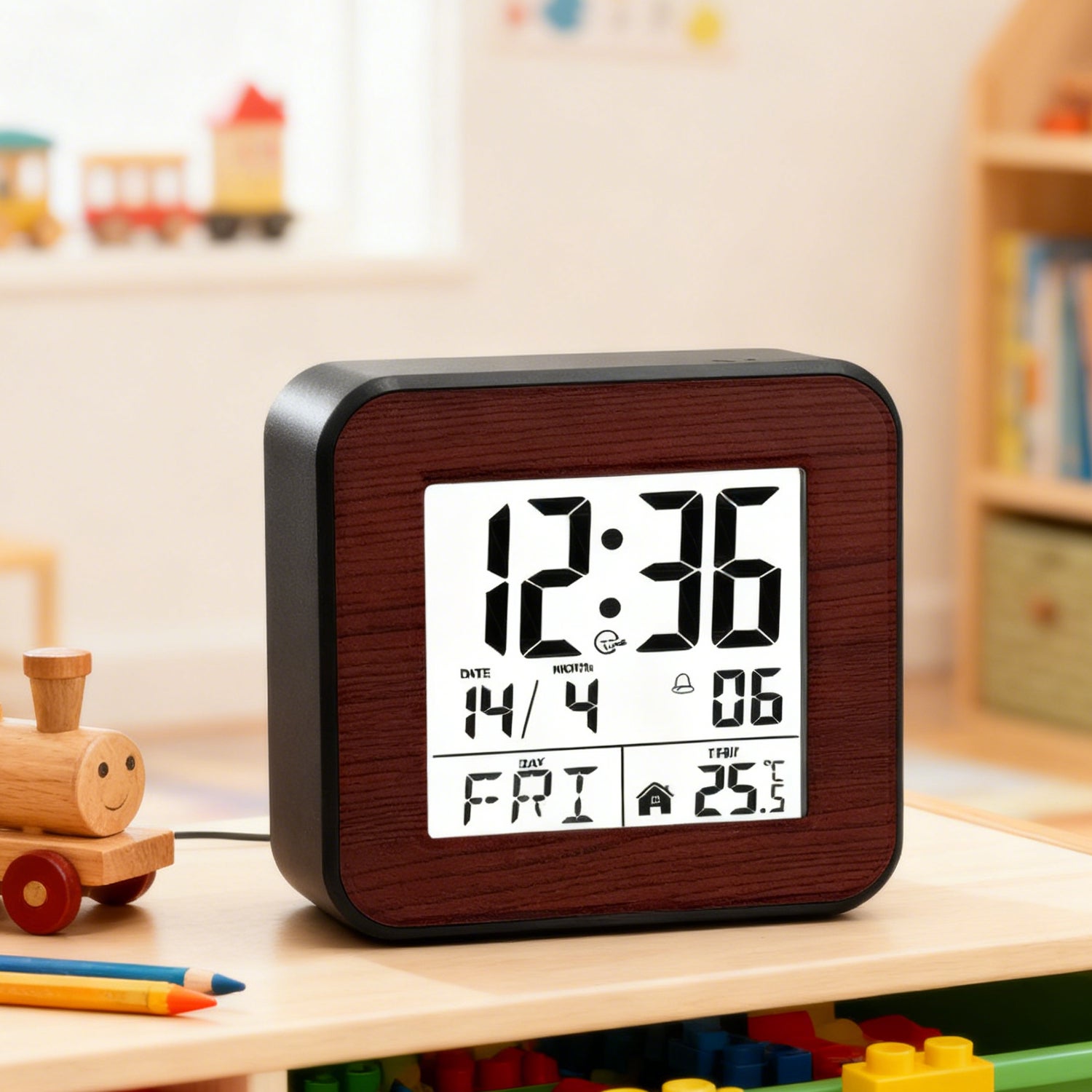 Mostra ora 12/24h, data, giorno e temperatura °C/°F con cifre grandi e leggibili. Perfetto per bambini, anziani e studenti.