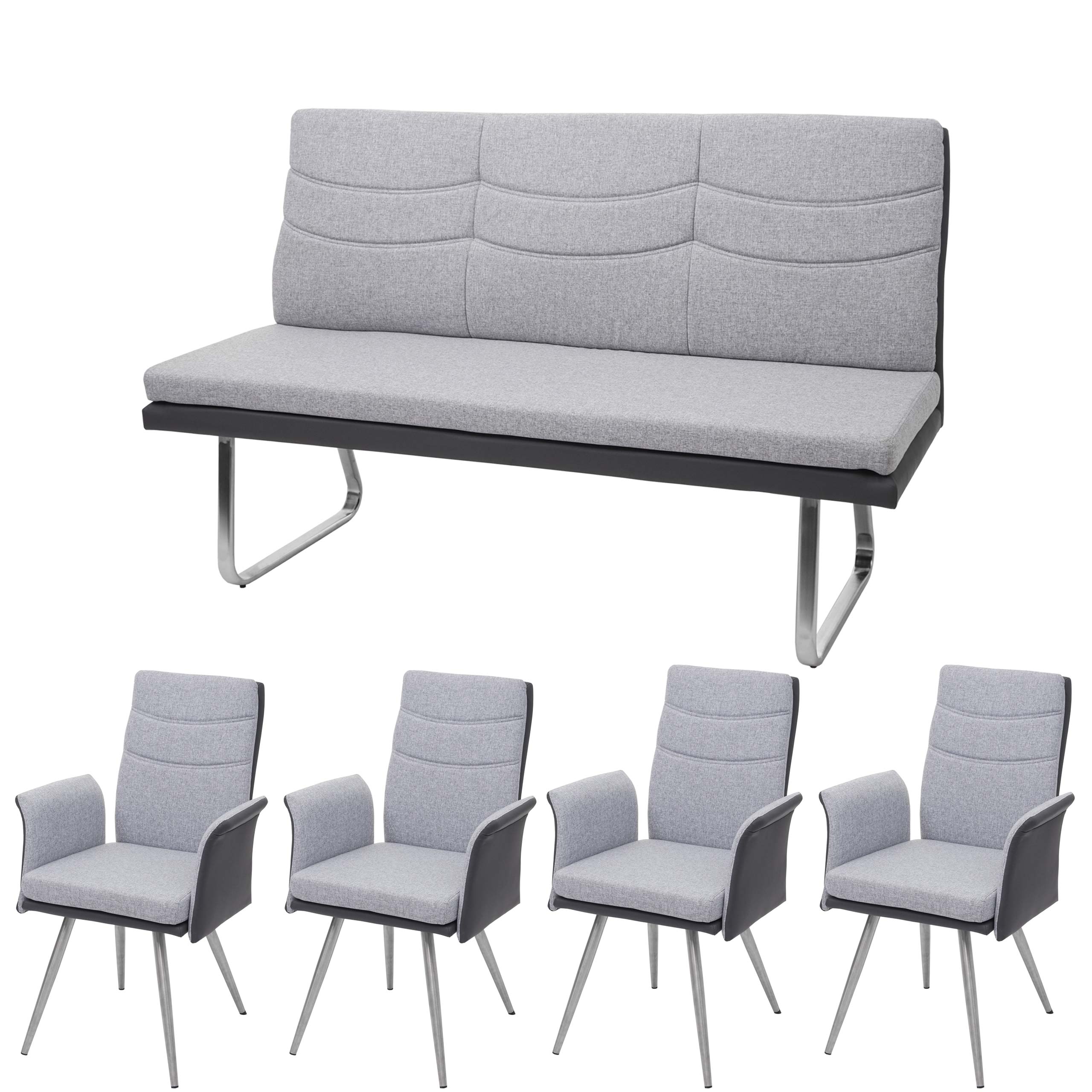 Set 4x sedie con braccioli e panca da interni HWC-G54 acciaio inox tessuto ecopelle grigio
