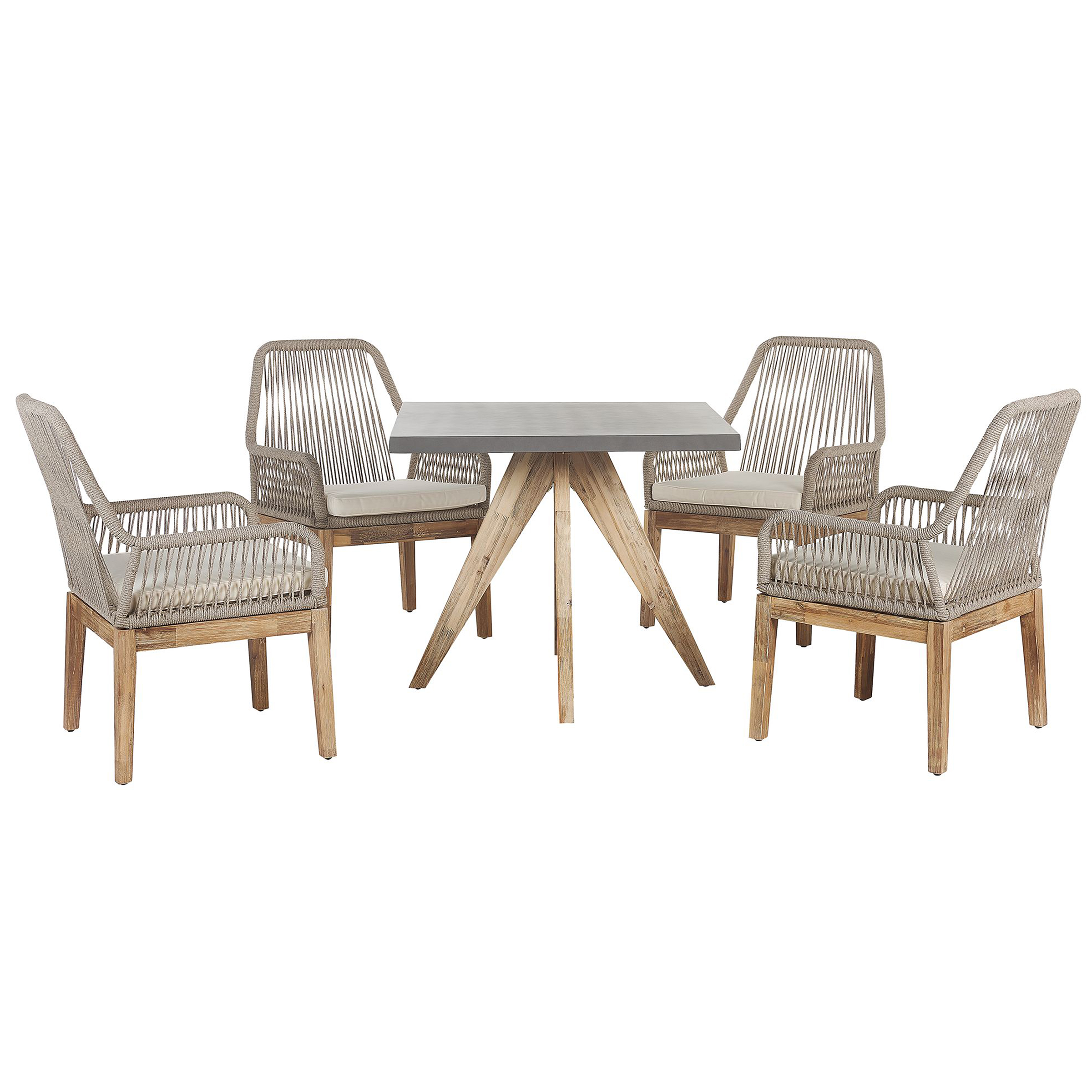 Set da giardino con struttura in legno d'acacia. Rinnova il giardino con questo set da pranzo composto da un tavolo da pranzo e 4 sedie. Tutti gli elementi sono stati realizzati a partire da materiali durevoli e resistenti agli agenti atmosferici. Il piano del tavolo è realizzato in fibra di cemento, facile da pulire, mentre i telai, sono in legno massiccio di acacia, in vero stile minimalista. Le sedie dallo schienale alto, presentano uno spesso cuscino, per un comfort di seduta sempre ottimale. L'accattivante accostamento cromatico poi, lo rende un arredo davvero unico, capace di valorizzare ogni spazio esterno.