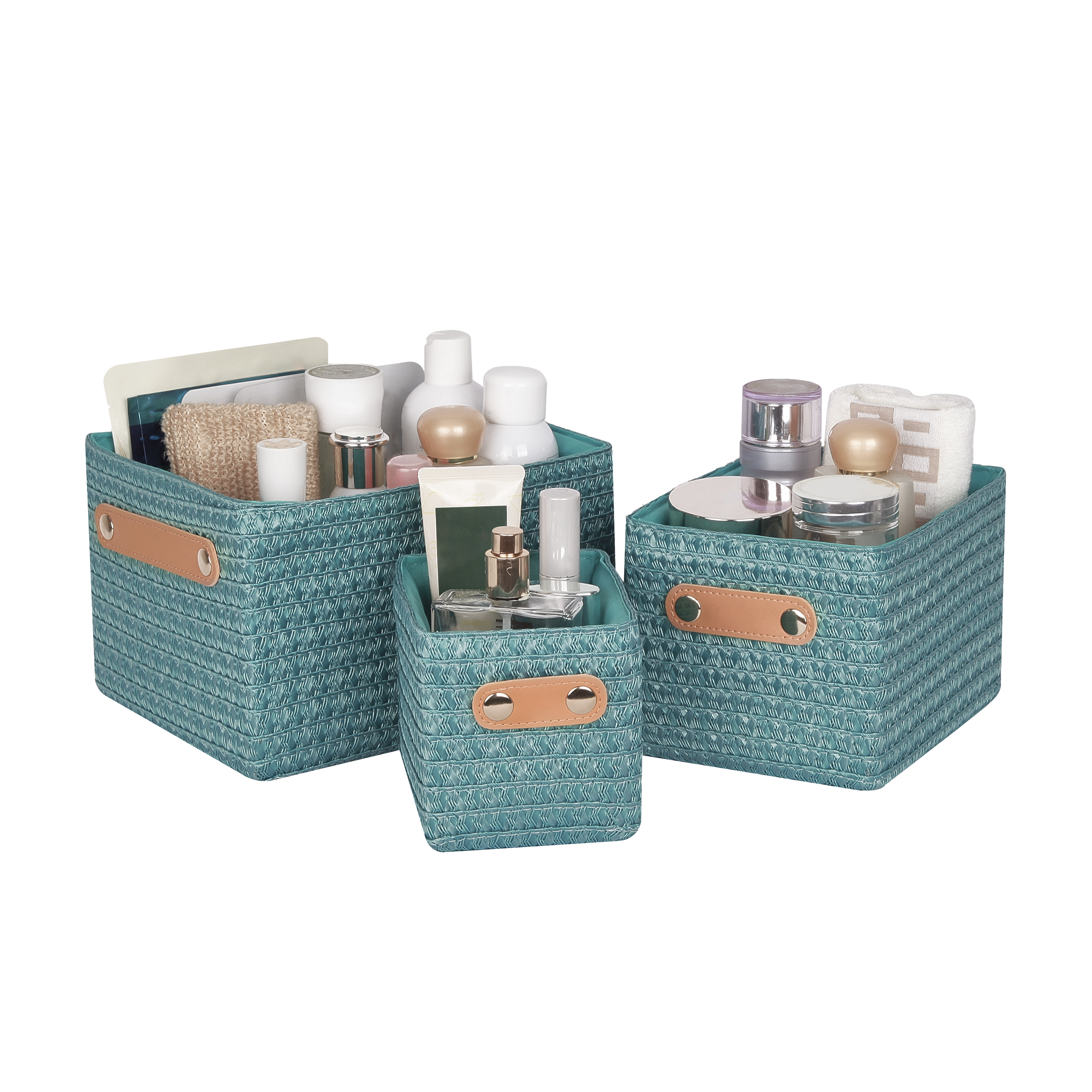 set di 3 cestini da bagno, finitura miami 1 blu, serie paille di sensea. disponibile in 3 dimensioni per soddisfare le diverse esigenze. misure: 19x16 cm.