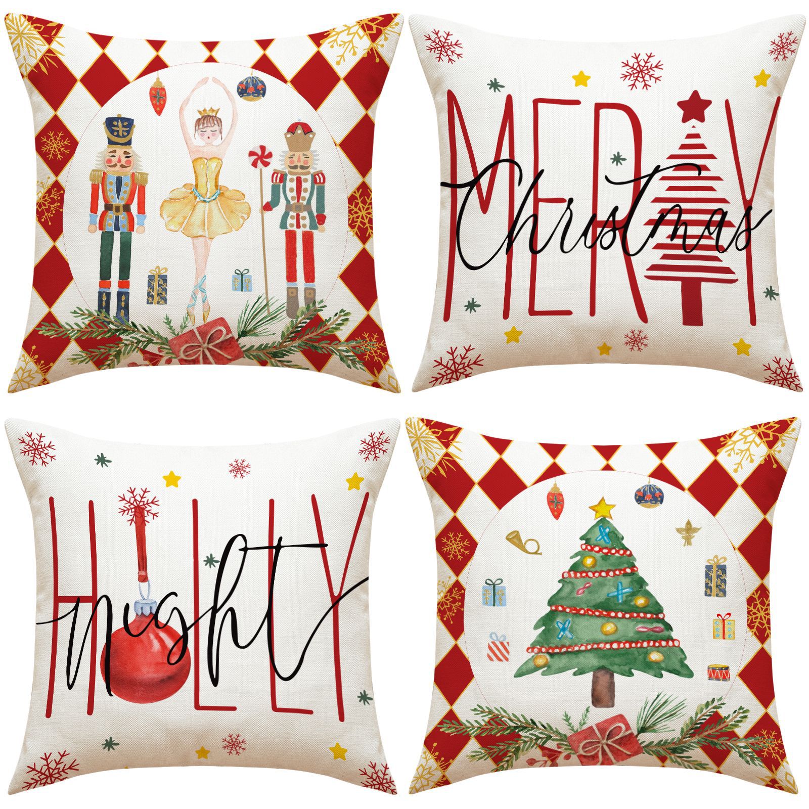Set di 4 federe natalizie Schiaccianoci, decorazione da giardino, federe Merry Christmas in cotone e lino, 45 x 45 cm