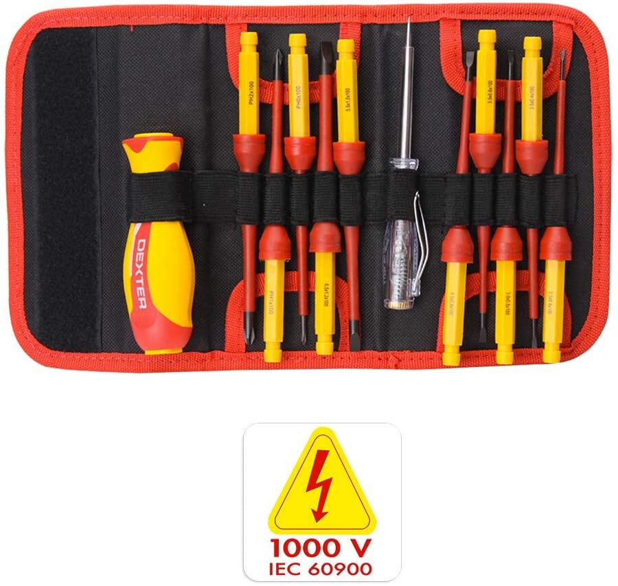 Set di 12 cacciaviti isolati in cromo vanadio: 7 piatti 2 / 2.5 / 3 / 3.5 / 4 / 5.5 / 6.5 *100 mm; 3 a croce philips PH0/PH1/ PH2*100 mm. 1 impugnatura modulare e un1 tester elettrico. In pratico astuccio che ne facilita la conservazione ed il trasporto
