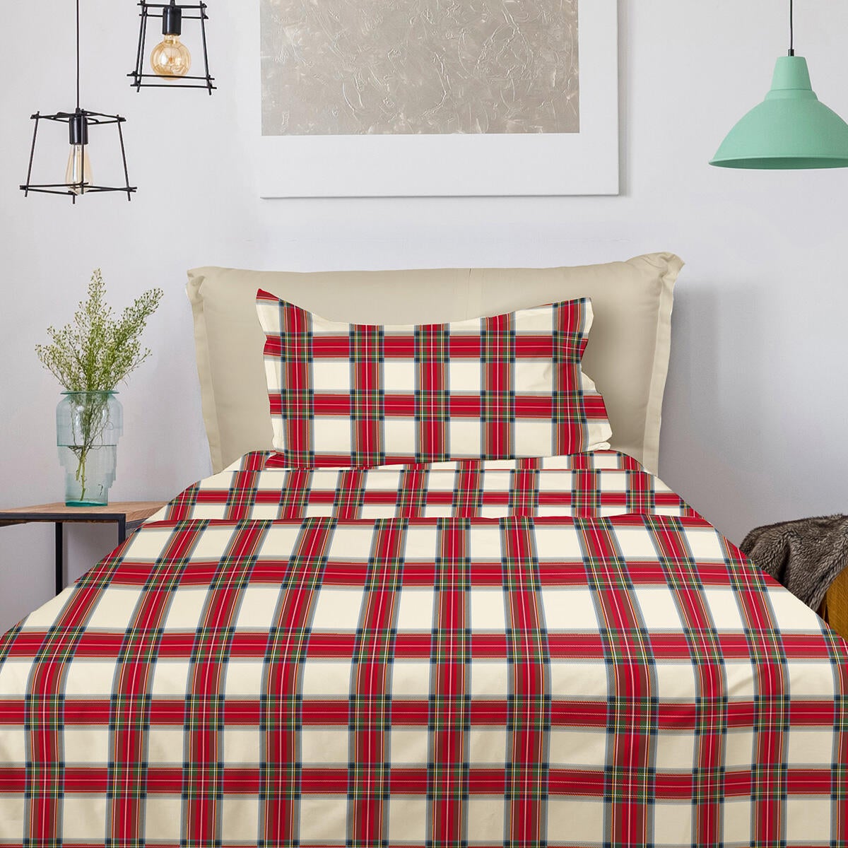 Il completo letto della linea Clan è realizzato in puro cotone, al tatto molto soffice e confortevole, caratterizzato da un'elegante fantasia tartan nel colore beige. Il completo per letto singolo è composto dal lenzuolo sopra che misura 160x500, dal lenzuolo sotto con angolo che misura 90x200 altezza dell'angolo 25cm e da una federa a sacchetto nella misura 52x82