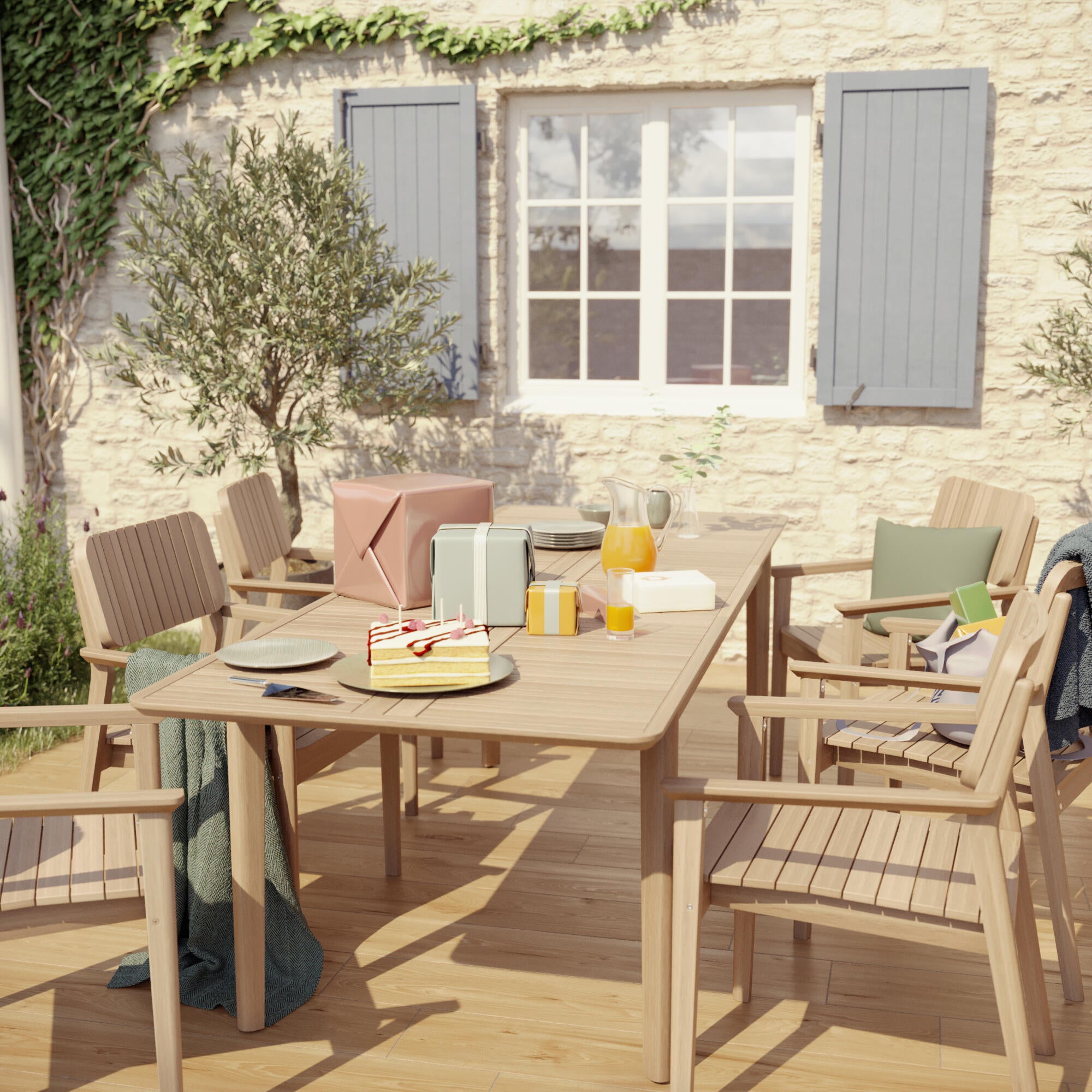 Una zona pranzo espandibile per godersi un barbecue con gli amici Ideale per ospitare 6 persone, il set da tavolo Atlas e le sue 6 poltrone è ideale per gustare un pasto nel patio o in giardino. Il tavolo ha una sorpresa: il suo piano nasconde una prolunga a farfalla che, una volta aperta, permette di ospitare comodamente altre 2 persone. Le sei poltrone offrono un'ampia seduta e braccioli spessi e morbidi al tatto per un maggiore comfort. Impilabili, sono facili da riporre quando la stagione finisce. Questo elegante set è realizzato in legno di acacia. Naturalmente resistente, questo legno esotico dal colore simile a quello del teak grezzo offre una lunga durata ai vostri mobili, stagione dopo stagione. Il design naturale e tradizionale del set Atlas gli permette di trovare facilmente posto nel vostro giardino o nel vostro patio, conferendogli un aspetto caldo. Per gustare un caffè a fine pasto, vi consigliamo il salotto da giardino Atlas, che riprende i codici di design del tavolo per una perfetta armonia dei vostri esterni, all'ombra dell'ombrellone off-set Naterial Aura. La manutenzione è semplice, basta un po' di acqua calda e sapone di Marsiglia per pulire il legno. Per preservare in modo duraturo i vostri mobili, è necessario nutrire il legno con olio di teak una o due volte l'anno e proteggerlo in inverno con la copertura traspirante Naterial. Per preservare il colore originale del tavolo si può anche applicare uno sgrassatore. Data la natura viva del legno, si consiglia di stringere le viti del set ogni anno. L'acacia è un materiale vivo riciclabile al 100%. Proviene da foreste la cui gestione è riconosciuta come responsabile e sostenibile. Questi prodotti sono verificati da un organismo indipendente che ne garantisce l'origine legale e responsabile. Il nostro fornitore, con sede in Vietnam, è impegnato nel processo di certificazione dal 2009 e ha costruito partnership durature con subappaltatori e fornitori locali.