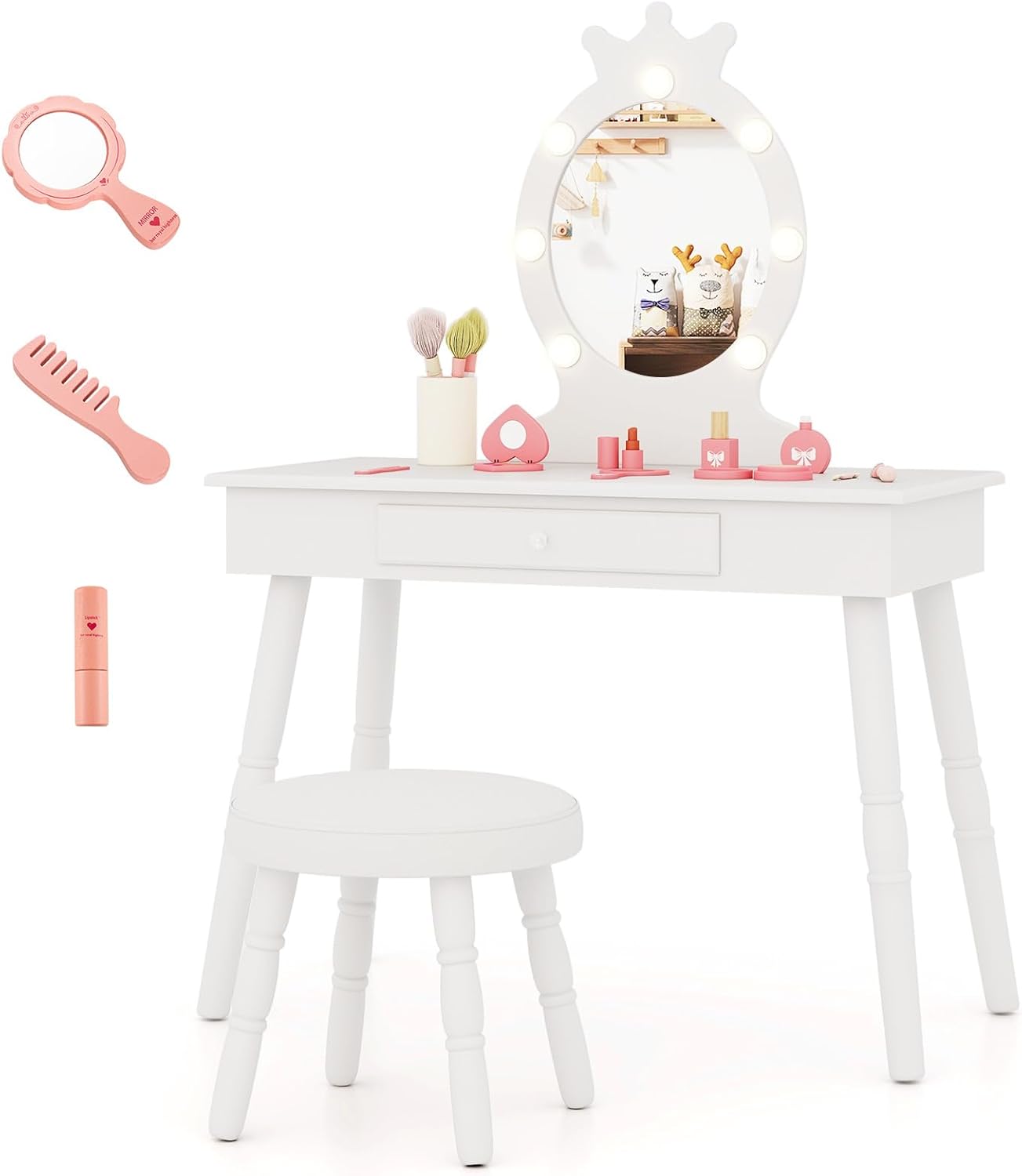Ci sono 3 modalità di illuminazione tra cui scegliere. Il tuo piccolo può anche regolare la luminosità della luce. La forma della corona in cima attira anche i bambini. Nel frattempo, il tavolo da trucco ha un cassetto estraibile per conservare gli articoli da trucco dei bambini. Il pouf imbottito offre un posto dove i bambini possono riposare. Inoltre, l'MDF di alta qualità e il legno di pino rendono il tavolo e la sedia abbastanza robusti per garantire un uso duraturo.