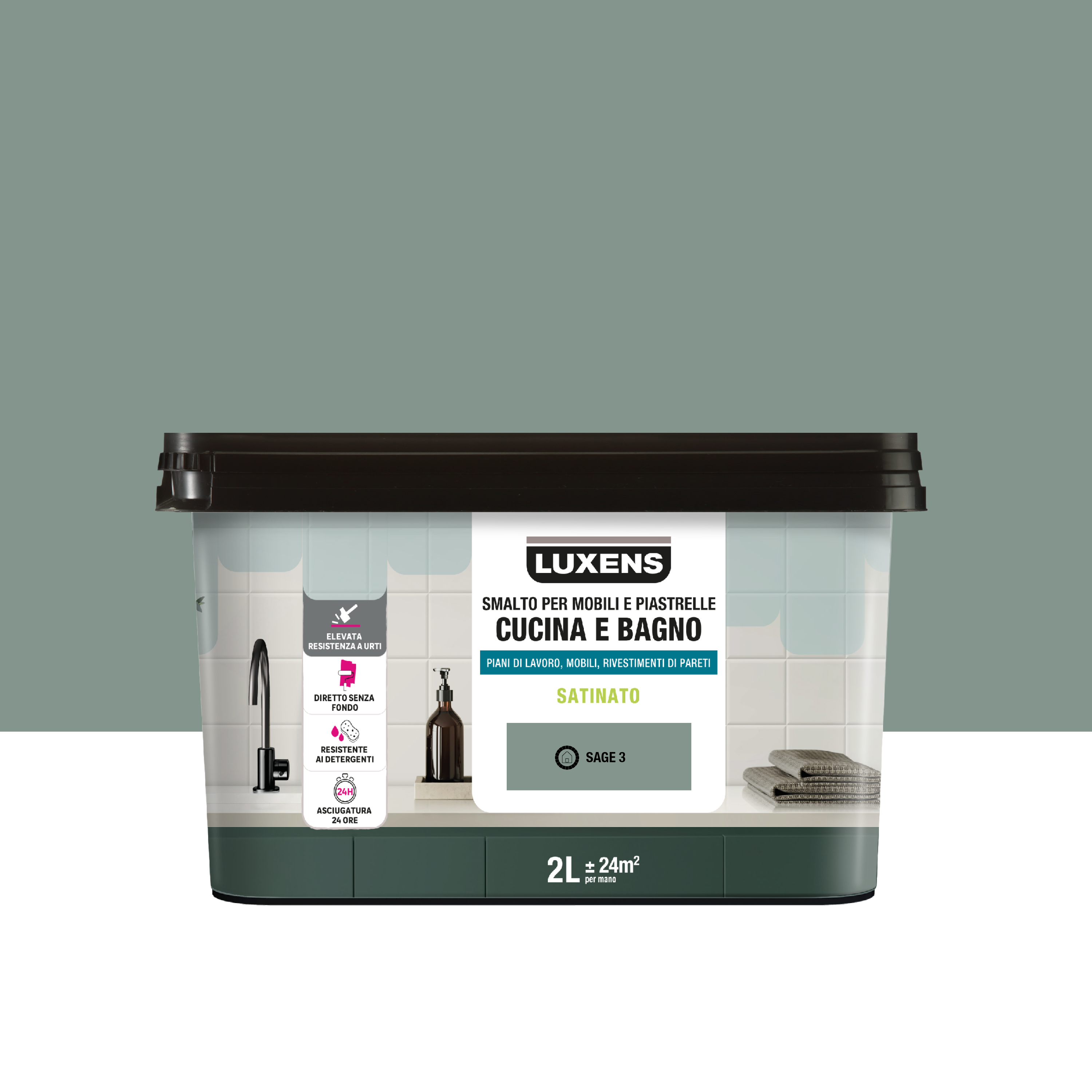 Smalto da interno per mobile e piastrelle super lavabile, antimacchia, LUXENS Cucina e Bagno verde sage 3 satinato, 2 L
