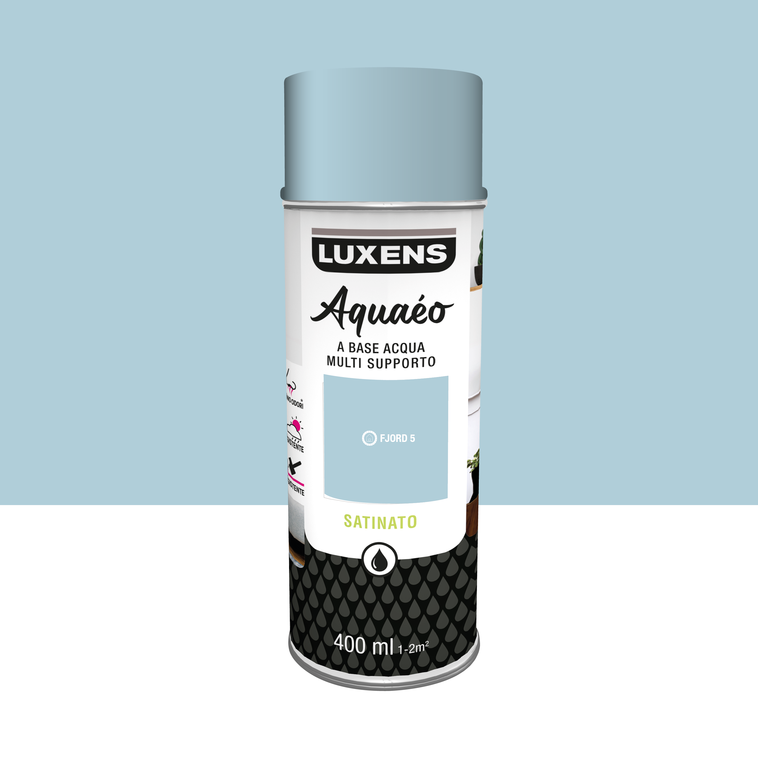 Aquaeo è una vernice spray Luxens ed è ideale per dipingere e decorare i tuoi supporti interni ed esterni: acciaio, legno, vetro, melaminico e PVC. Grazie alla formula a base d'acqua, Aquaeo ha meno odore di una vernice spray a base di solvente e può essere applicata all'interno e senza fondo. La vernice resiste a tutte le condizioni atmosferiche e agli urti e ai graffi.
