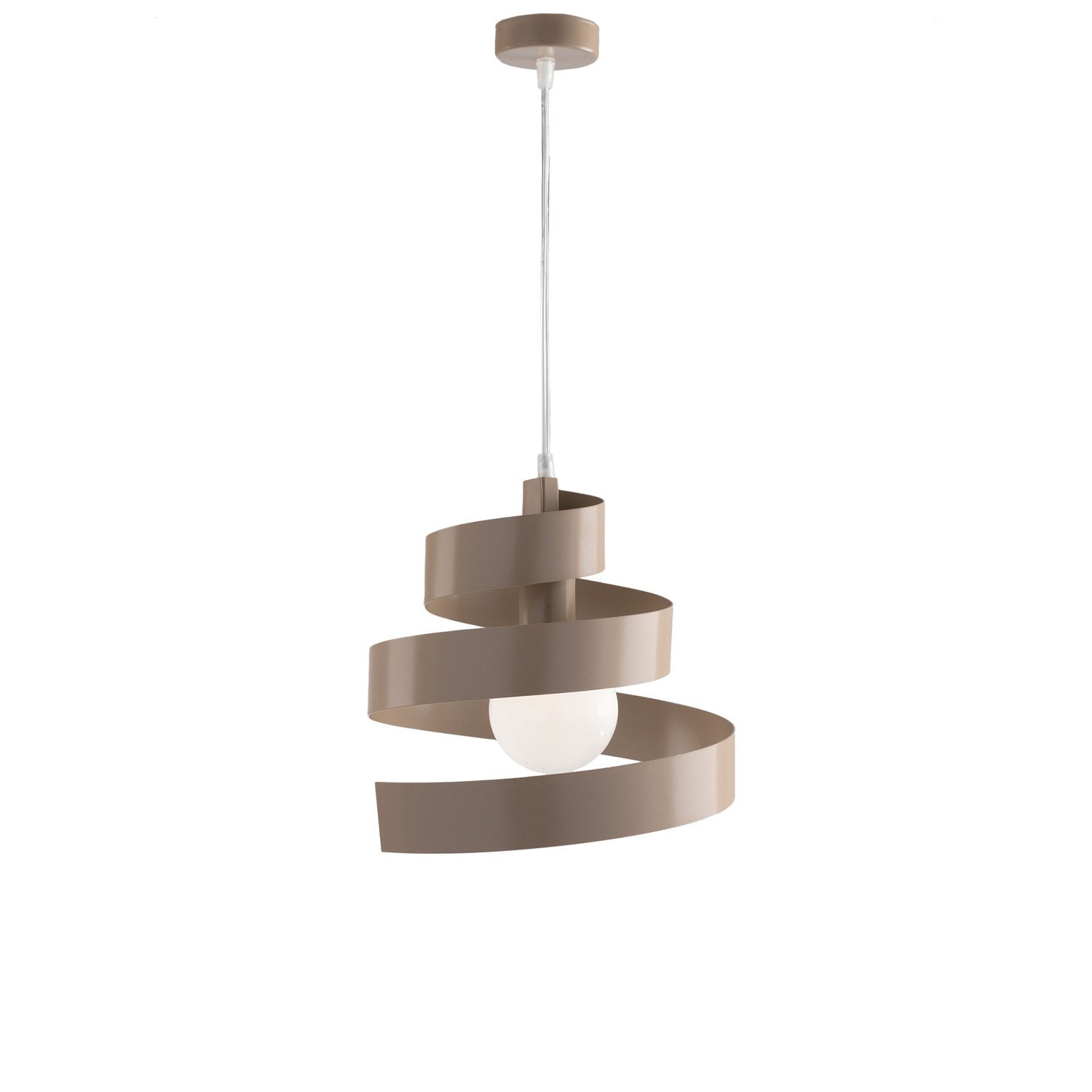 Sospensione moderna a 1 luce in ferro laccato tortora con pittura termoindurente con struttura a ricciolo verticale. . Cablaggio trasparente; il particolare design e le forme molto ricercate, sono in grado di arredare e arricchire qualsiasi ambiente in maniera piacevole e frizzante. Disponibile anche nella tonalità bianco e grigio.