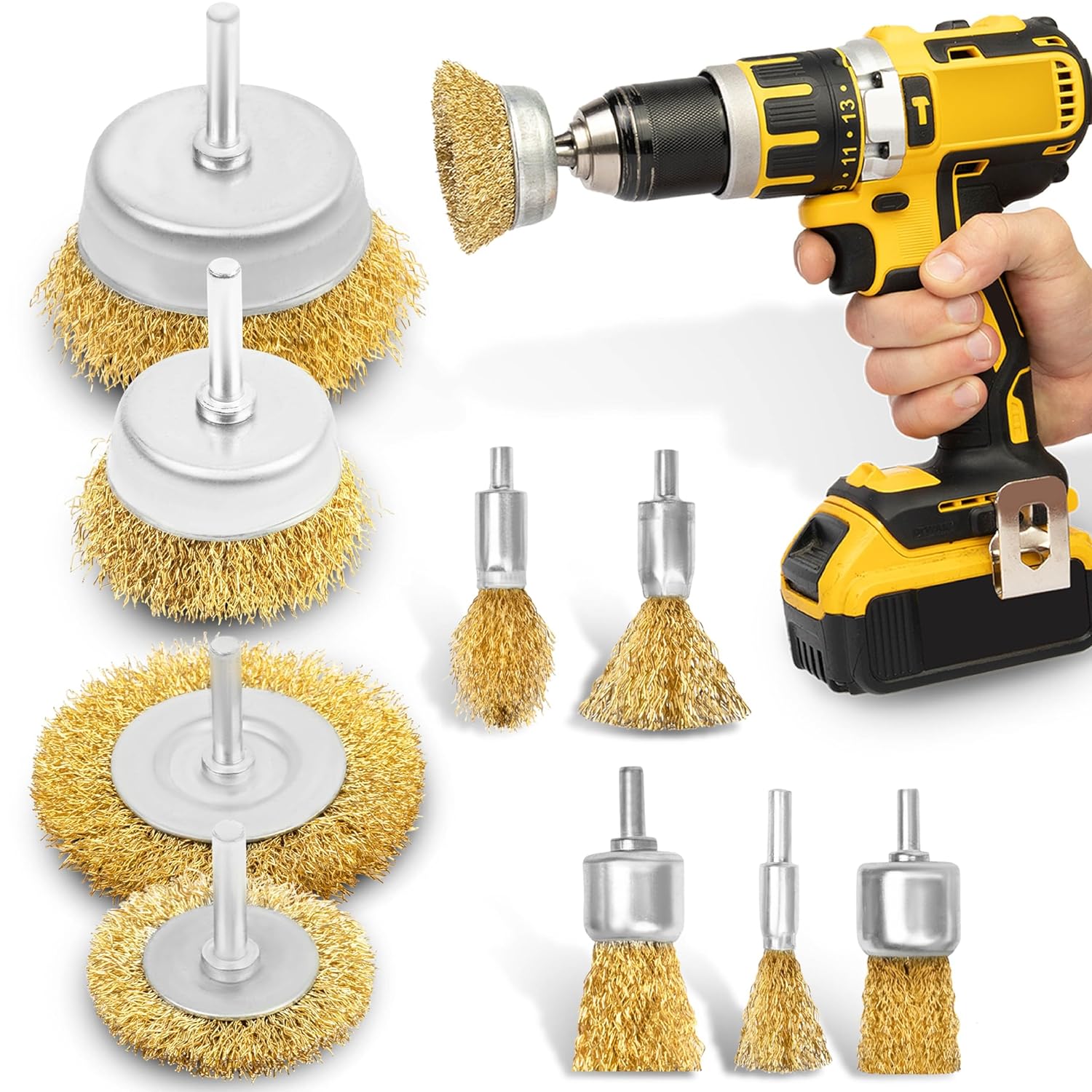 RIVESTIMENTO IN OTTONE - Questo set di spazzole metalliche elettriche è dotato di filo di acciaio rivestito in ottone, che le rende ideali per la pulizia, la rimozione della ruggine, la rimozione di vernice scrostata e la preparazione di superfici metalliche per la verniciatura, tra le altre attività. GAMMA DI DIMENSIONI DELLE SPAZZOLE - 9 diverse spazzole metalliche in totale. 2 spazzole rotonde - 50, 75 mm. 2 spazzole a tazza - 50, 75 mm. 4 spazzole a punta metallica - 10, 16, 25, 30 mm. 1 spazzola conica di precisione - 16 mm. SET DI SPAZZOLE DI PRECISIONE - Strumenti progettati per un facile accesso a crepe e angoli difficili da raggiungere. Pulisce, lucida, rimuove ruggine e vernice dalle aree più difficili da raggiungere di mobili, macchinari e altri materiali. ADATTO ALLA MAGGIOR PARTE DEI TRAPANI - Questo set di punte per trapano con spazzola metallica in ottone include un attacco esagonale da 1/4" per adattarsi a tutti i trapani. Completa la tua collezione di punte per trapano con questo pratico set di spazzole metalliche per trapano. IMPIEGO LEGGERO/MEDIO - Ampia selezione di spazzole metalliche per la rimozione moderata della ruggine, la pulizia e la lucidatura delle superfici. Sostituzione rapida e semplice della testa utilizzando la punta del trapano.
