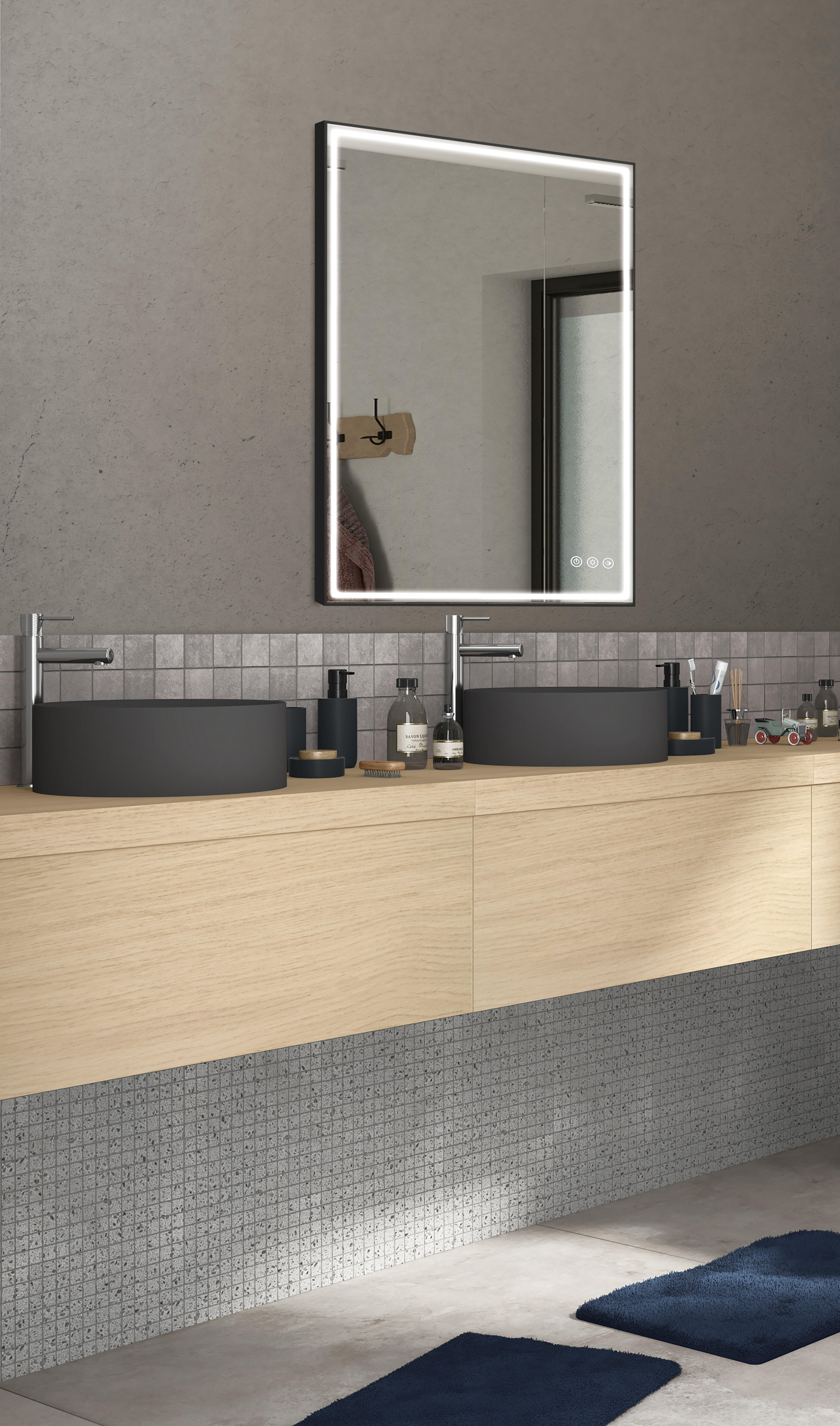 Specchio rettangolare con luce integrata dalle dimensioni di 90 cm di larghezza, 90 cm di altezza e 3.2 cm di profondità. Lo specchio può essere installato in maniera molto semplice sia orizzontalmente che verticalmente. La tecnologia di illuminazione a LEDè controllata tramite un interruttore touch; la retroilluminazione, inoltre, offre al prodotto un look moderno ed elegante. Lo specchio è dotato di tecnologia antiappannamento, il che lo rende ideale anche per i bagni più piccoli, e di una finitura di sicurezza sul vetro, che impedisce al prodotto di frantumarsi in pezzi piccoli in caso di rottura. La certificazione IP44, inoltre, garantisce la protezione del prodotto contro gli schizzi accidentali di acqua, inevitabili in un ambiente come quello del bagno. La luce regolabile permette di passare dai toni caldi a toni freddi in modo semplice a seconda delle proprie necessità. L'intensità regolabile, inoltre, permette di creare diverse atmosfere nel proprio bagno. Il prodotto è garantito per 5 anni.