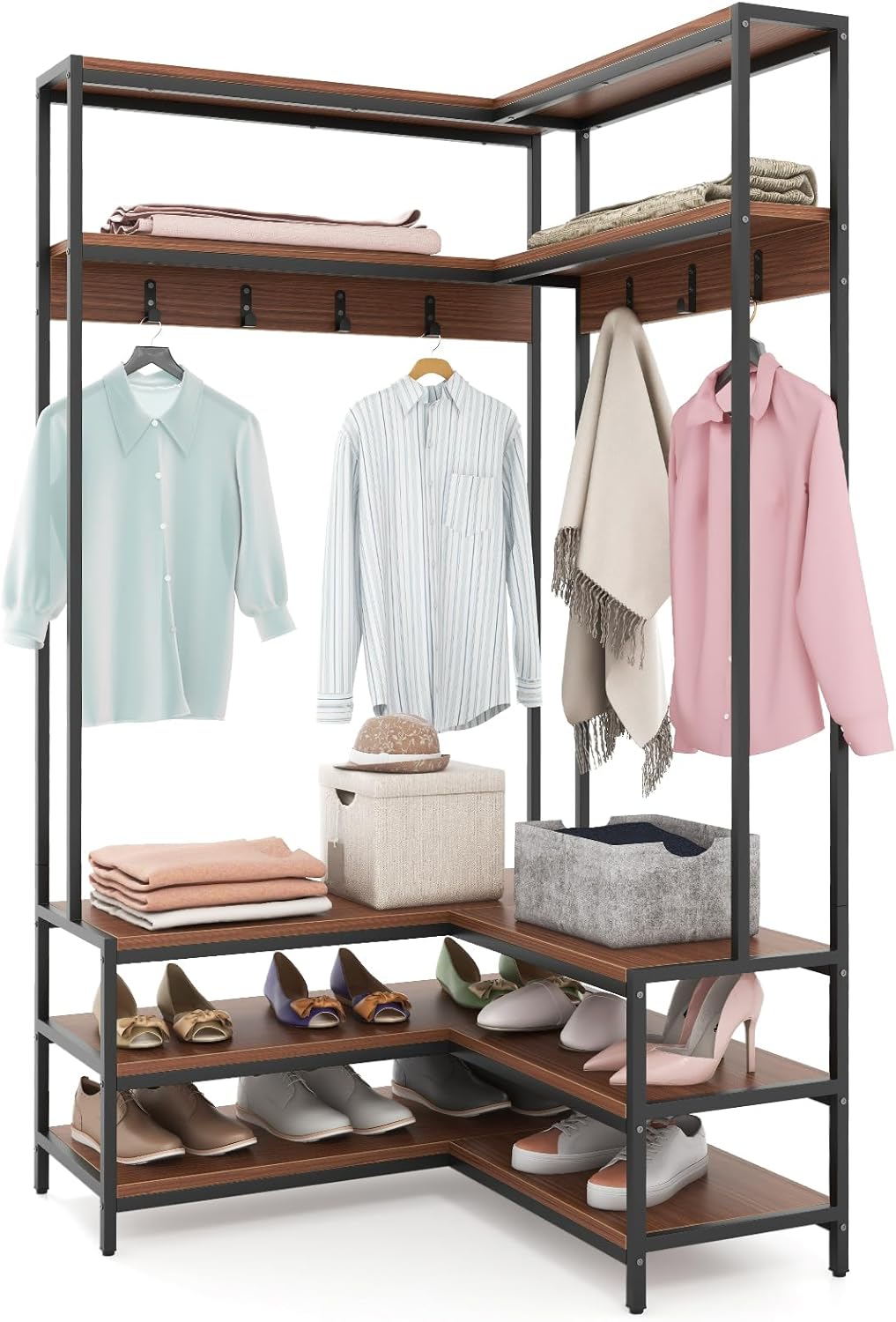 Stand Appendiabiti Angolare, Appendiabiti a Forma L con Ripiani Aperti 7 Ganci e Panca per Scarpe, Struttura in Metallo e Piedini Regolabili,