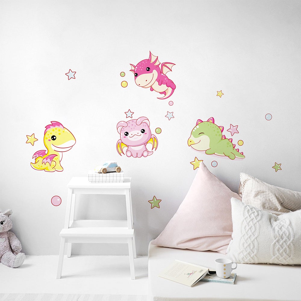 Sticker adesivi murali, Draghi per bambini e bambini multicolori a stella su uno sfondo bianco, 68 cm x 24 cm