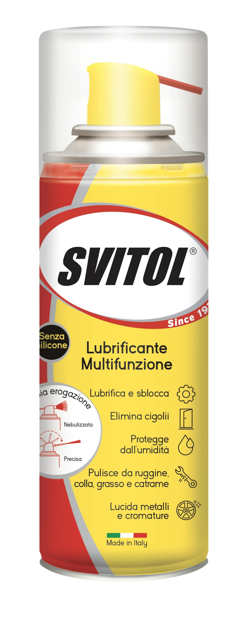 LUBRIFICA, ELIMINA GLI ATTRITI, SBLOCCA, ELIMINA L’UMIDITÀ, PREVIENE LA RUGGINE E PROTEGGE TUTTE LE SUPERFICI METALLICHE. GRAZIE ALLA SUA ESCLUSIVA MULTIFUNZIONALITÀ, SVITOL LUBRIFICANTE È IL PRODOTTO IDEALE PER MILLE OCCASIONI D’USO, DALL’INDUSTRIA ALL’AUTORIPARAZIONE, DALLA CASA AL GIARDINO, DALLO SPORT ALLA NAUTICA, DAL LAVORO AL FAI DA TE.