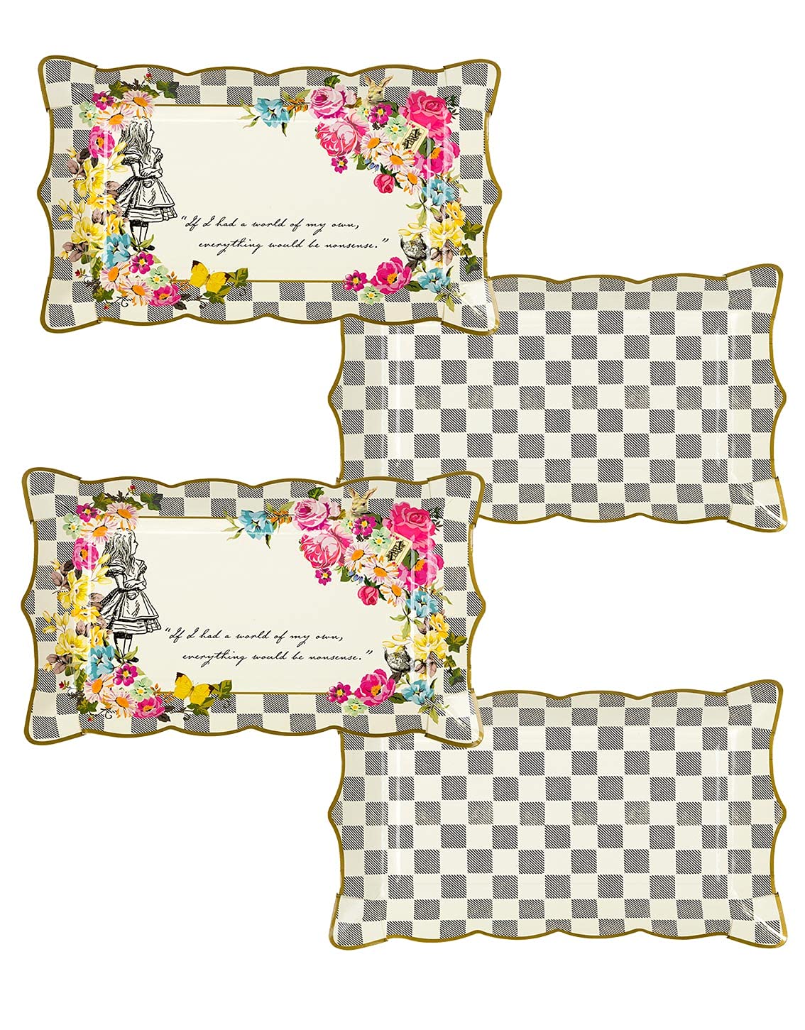 PIATTO DA FESTA DELIZIOSAMENTE SCONCERTANTE: IL MODO IDEALE PER BANCHETTARE CON DOLCI DOLCETTI, SIA PER UNA FESTA DI COMPLEANNO CHE PER IL TÈ POMERIDIANO! OGNI CONFEZIONE VIENE FORNITA CON 4 PIATTI E PRESENTA 2 DISEGNI A SCACCHI CON UN'ILLUSTRAZIONE DI ALICE E UN MOTIVO FLOREALE. PERCHÉ NON POSIZIONARE UN VERO RUNNER DA TAVOLA ALICE SOTTO IL VASSOIO PER COMPLETARE LE TUE STRAVAGANTI DECORAZIONI DA TAVOLA. IN OMAGGIO AL CLASSICO ROMANZO DI LEWIS CARROLL, LA GAMMA ALICE DI TALKING TABLES È PIENA DI CHICCHE STRAVAGANTI CON QUEL TOCCO DI TEA PARTY PER CUI ALICE NEL PAESE DELLE MERAVIGLIE È COSÌ FAMOSA. IL TEMA PERFETTO PER MATRIMONI ESTIVI, GIARDINI E TEA PARTY, GRAZIE AL SUO STILE STRAVAGANTE E AI RIFERIMENTI INGLESI.
