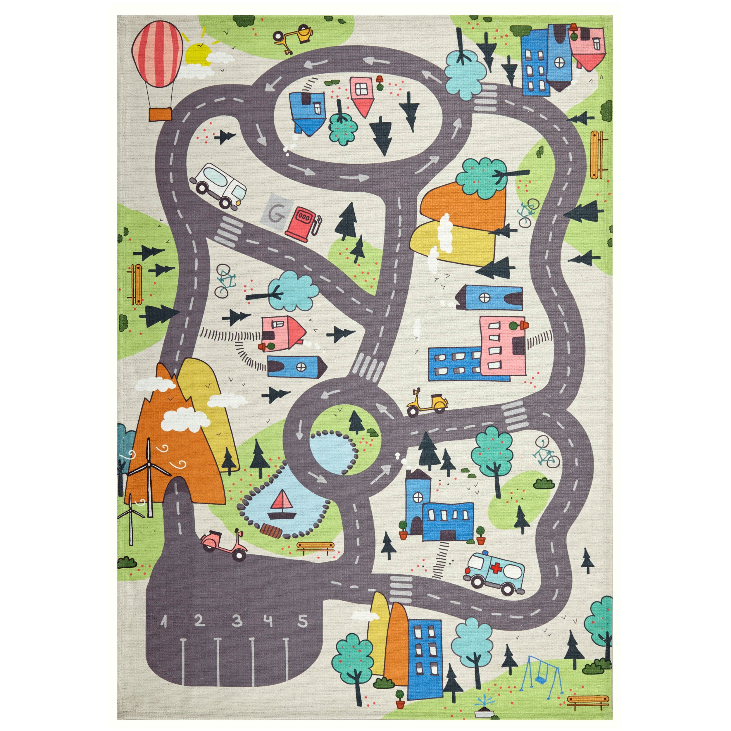 Tappeto per bambini con disegno stradale. Repelle l'acqua ed altri liquidi. Perfetto per ambienti infantili e giovanili.