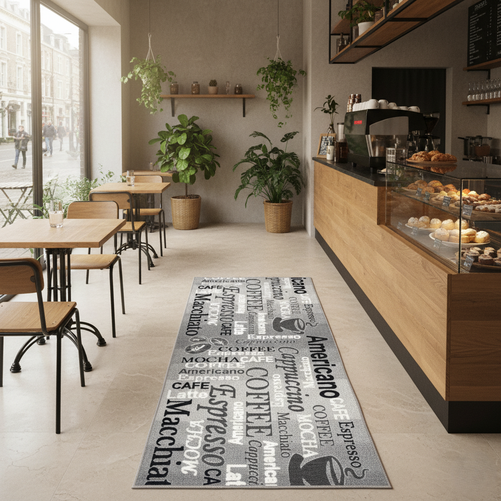 Unendo design moderno, fascino caffè e alta qualità, il tappeto passatoia «Coffee» dona un’atmosfera calda e accogliente ai tuoi ambienti. I suoi motivi eleganti — tazze, chicchi, macchine da caffè e scritte — trasformano ogni stanza in un vero angolo relax in stile caffetteria.