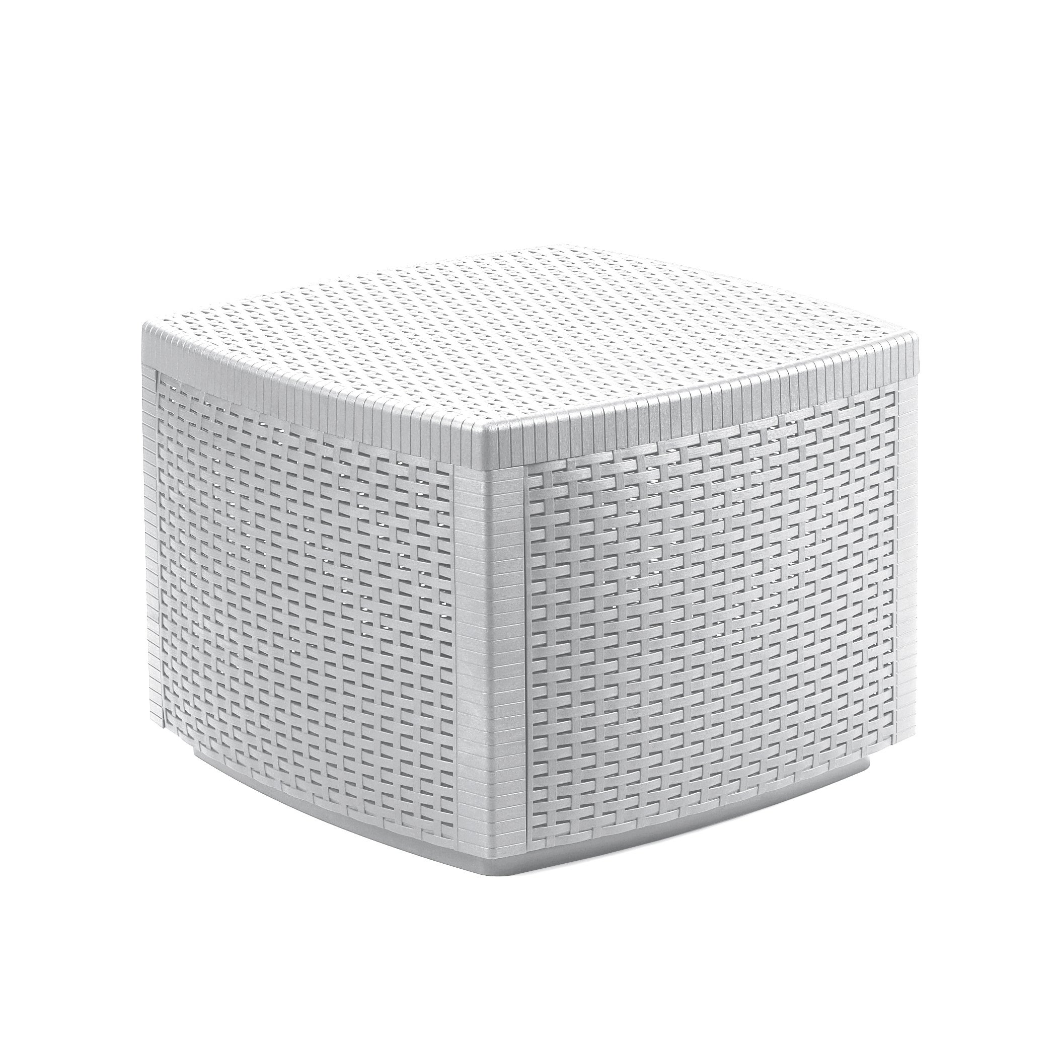 Tavolino da giardino quadrato LIPARI in resina con elegante aspetto in rattan. Componibile e robusta, coperchio removibile. Quindi è doppio uso: Come tavolino d'appoggio e contenitore. Colore bianco. Dimensioni: 53 x 53 x 40 cm (larghezza x profondità x altezza). Resistente alla ruggine e alle deformazioni dovute agli agenti atmosferici/muffe/smog/polvere. Sconsigliato utilizzo su superfici lisce. Grazie al robusto sistema plug-in, il tavolo può essere allestito in un batter d'occhio. Grazie al coperchio rimovibile, il tavolo offre molto spazio di archiviazione all'interno.