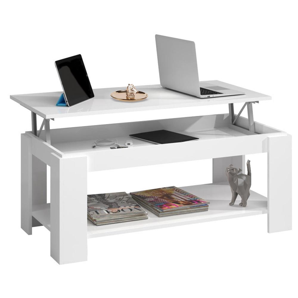 Tavolino Soggiorno con Rialzo Contenitore Tavolo Salotto Moderno Apribile Bianco