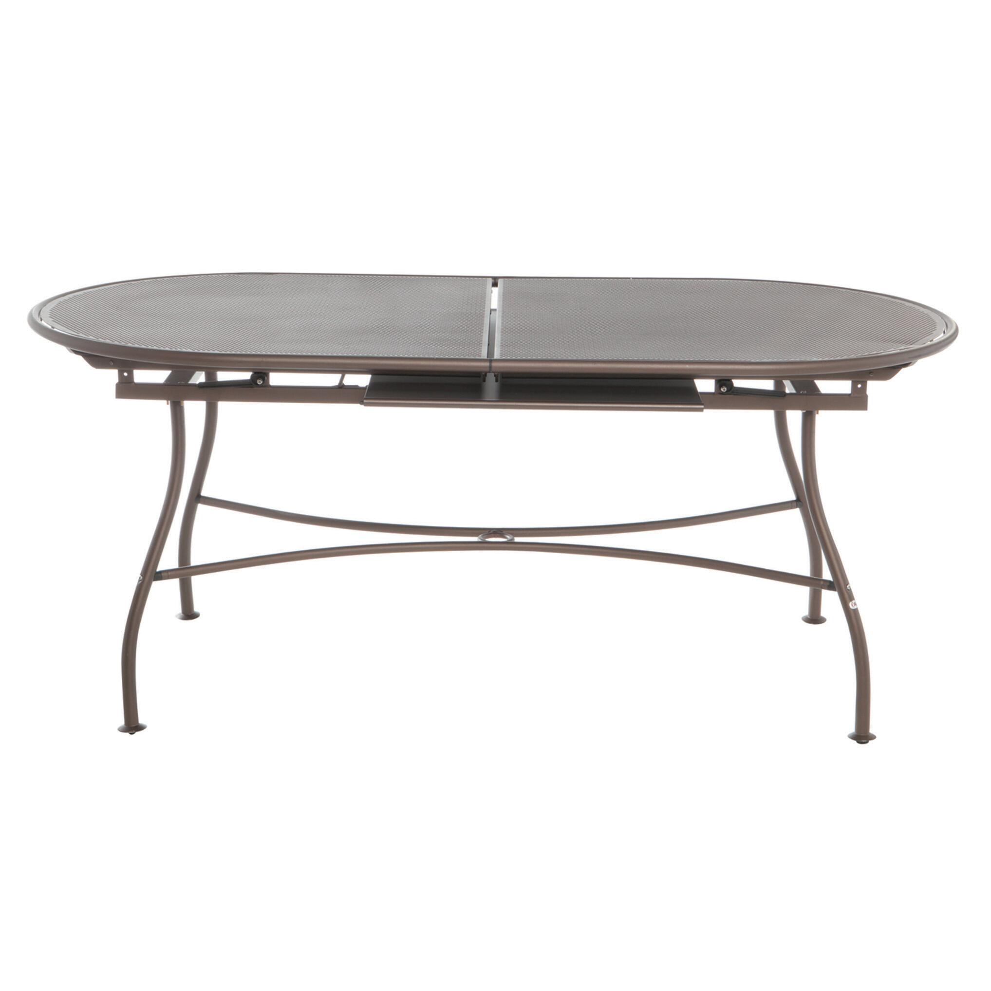 Tavolo da giardino allungabile ovale della serie EVO strutturato in ferro verniciato in cataforesi, allungabile fino a 240 cm. Con foro per ombrellone nella prolunga centrale. Colore marrone. Dimensioni da chiuso: 180 x 90 x 75 cm (larghezza x profondità x altezza) Dimensioni da aperto: 240 x 90 x 75 cm
