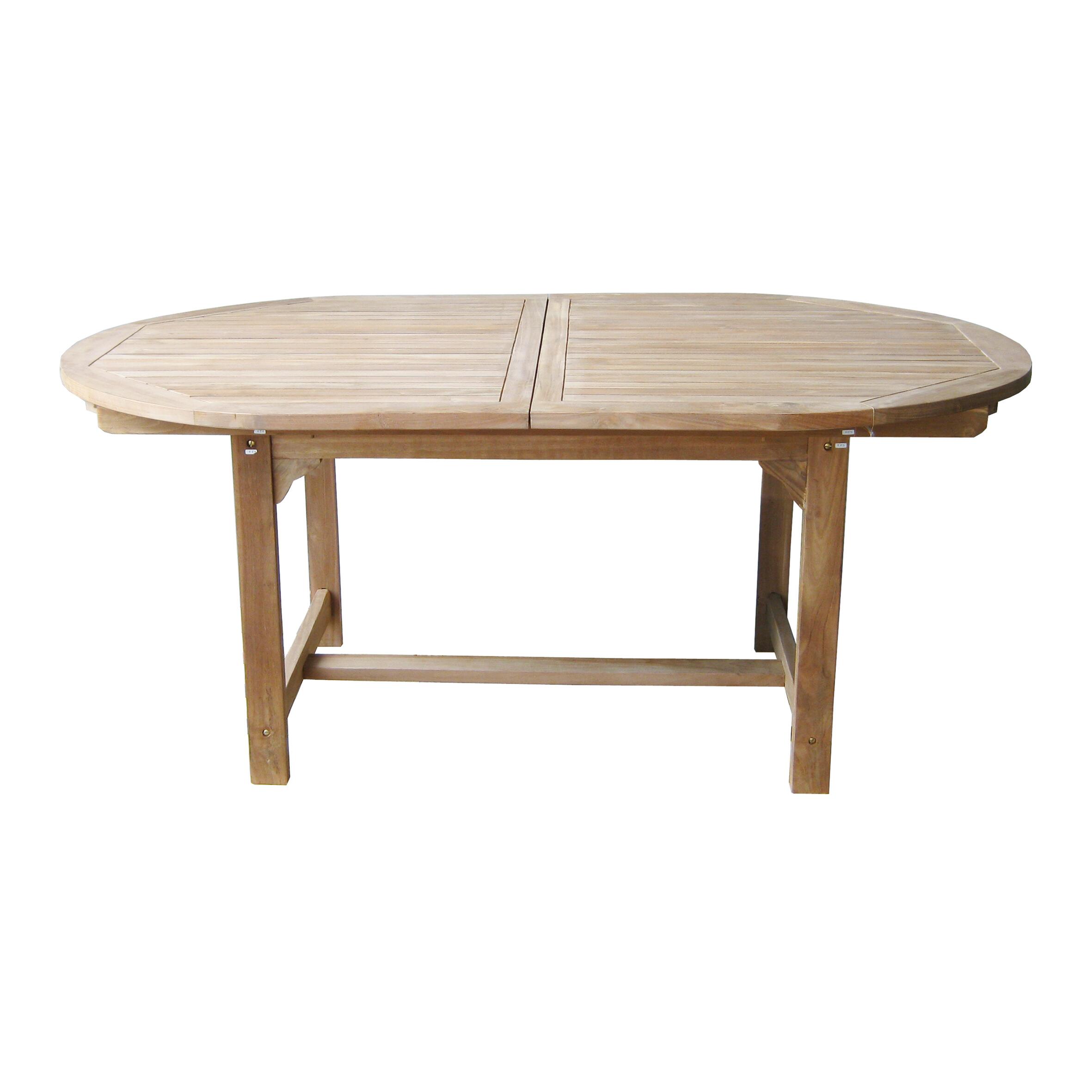 Tavolo allungabile da esterno e giardino, forma ovale, realizzato in legno di teak colore naturale. Dimensioni: 180/240 x 120 x 75 cm (larghezza x profondità x altezza).