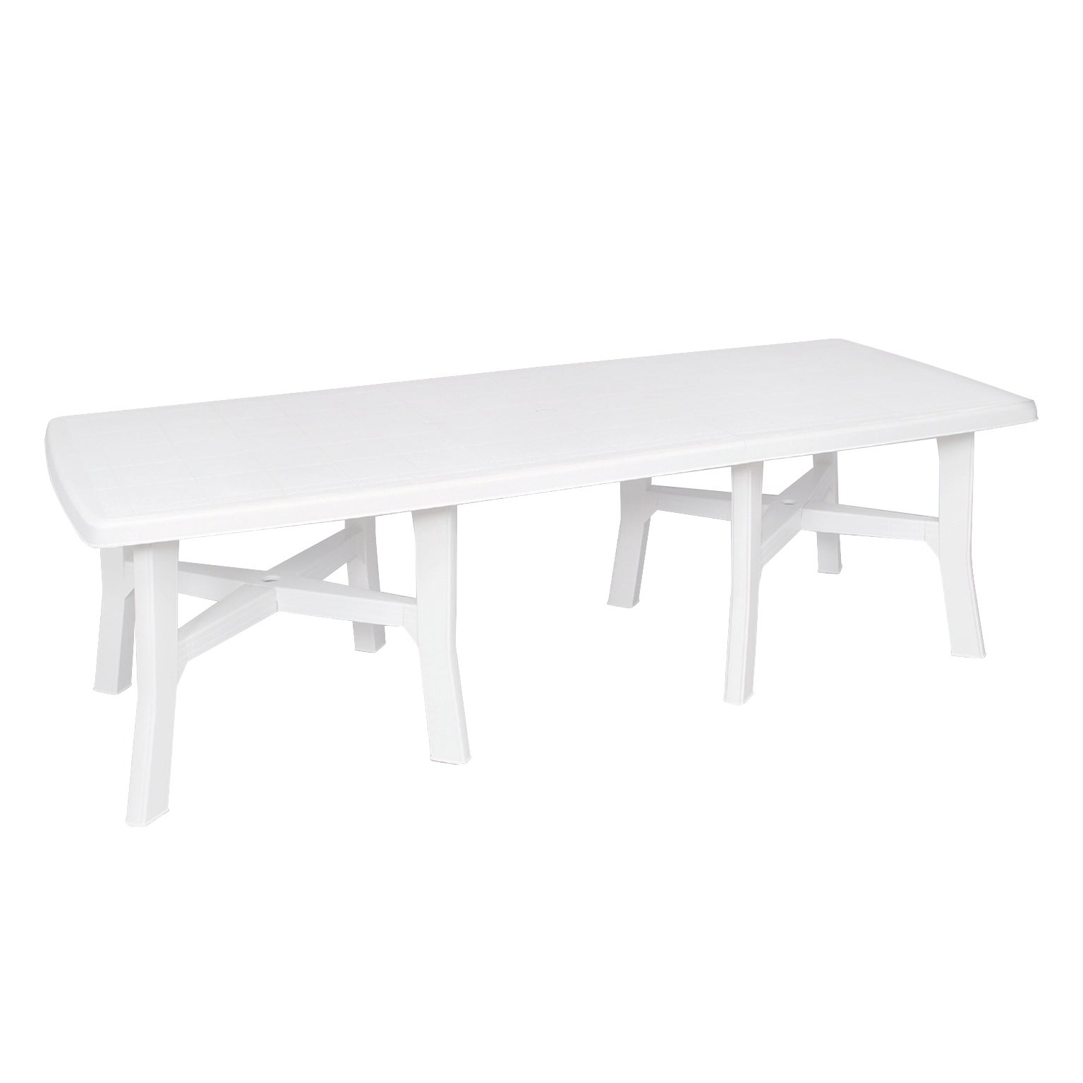 Tavolo da giardino allungabile rettangolare della serie TRIO PLUS strutturato in resina di polipropilene. Colore bianco. Dimensioni da chiuso: 180 x 90 x 72 cm (larghezza x profondità x altezza) Dimensioni da aperto: 240 x 90 x 72 cm. Allungabile per adattarsi alle diverse esigenze. Resistente alla ruggine e alle deformazioni dovute agli agenti atmosferici, adatto a un uso quotidiano. Per una maggiore protezione ricoverare in un luogo riparato nei periodi di non utilizzo - Provvisto di foro centrale per l'ombrellone - Tavolo versatile, grazie alla prolunga permette di ospitare ancora più persone. Il polipropilene utilizzato nella produzione è conforme agli standard di qualità europei: i prodotti sono solidi, resistenti alle intemperie e completamente riciclabili.
