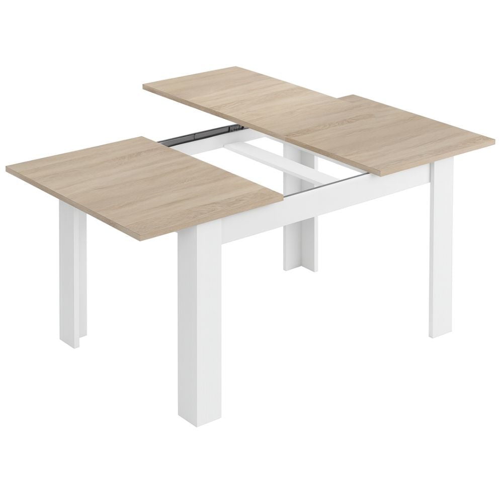 Il design moderno caratterizzato dai colori bianco e rovere, consente di collocare questo tavolo estensibile in cucina, salotto o soggiorno.
