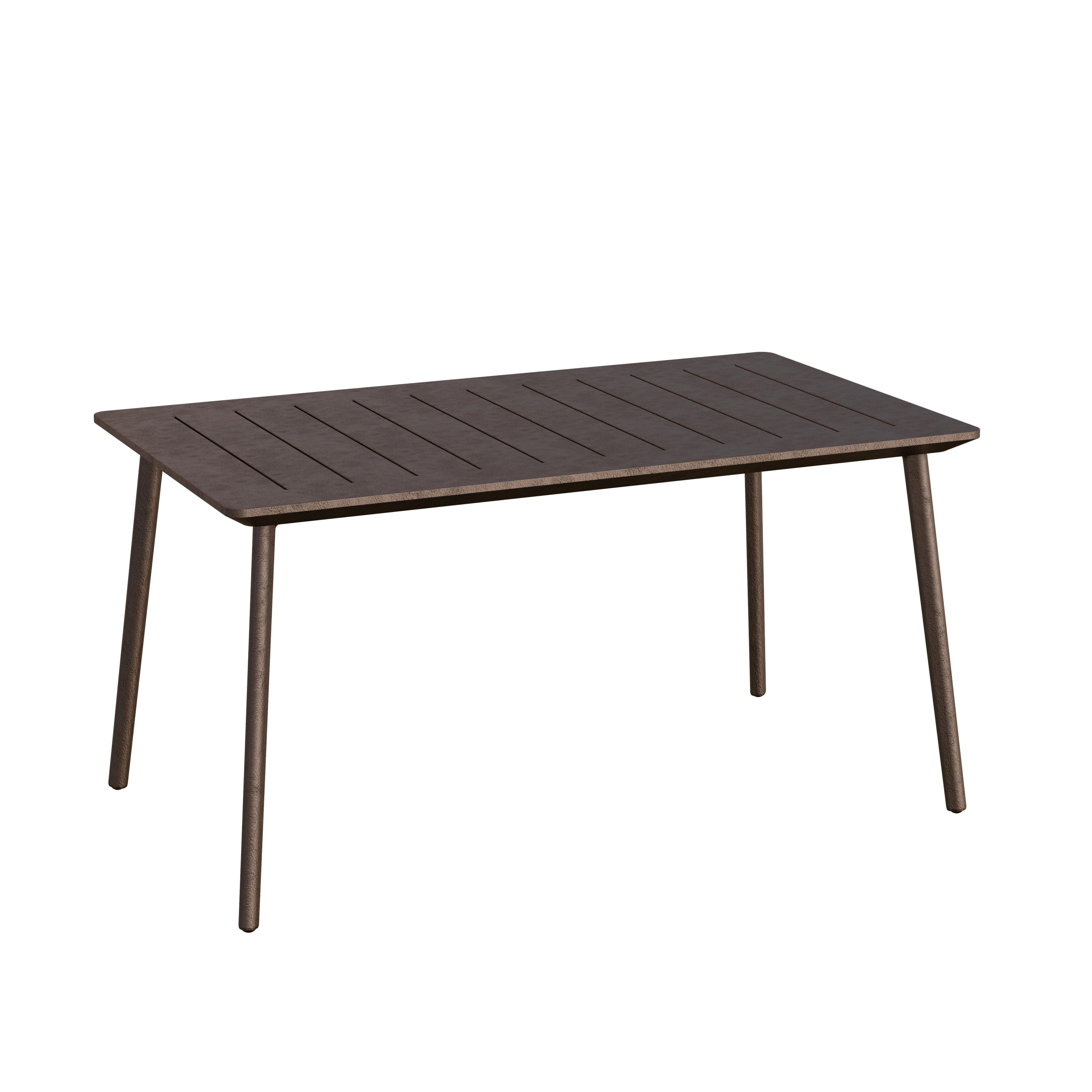 Tavolo da pranzo METALEA per giardino o terrazzo. Forma rettangolare. Il suo design moderno simula l'estetica della forgiatura riproducendo l'effetto del metallo, ma è molto più leggero grazie al pannello in resina. Per la sua manutenzione si consiglia di riporlo al coperto, al riparo dal sole diretto, e di riporlo in luogo asciutto e ventilato quando non utilizzato (oppure coprirlo con un telo per mobili). Si combina con il resto degli elementi della serie Metalea. Dimensioni: 146 x 90 x 75 cm (larghezza x profondità x altezza)