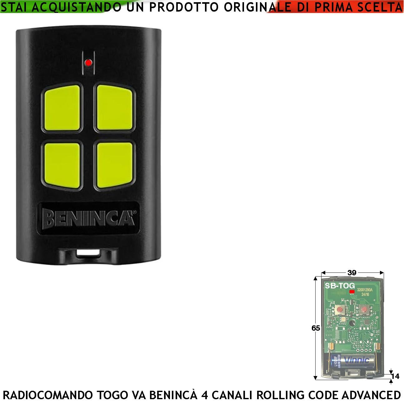 SB-TGQ ,Radiocomando ,Quatricanale. Frequenza di trasmissione 433,92 MHz. Codifica ,Benincà, Advanced Rolling Code ,a ,128 Bit. Segnalazione ,Trasmissione tramite Led. Portata in Aria Libera 60/100 metri. Batteria 12 V 23A. Contenitore ABS nero 4 Tasti gialli. Grado di Protezione IP40. Temperatura di funzionamento -5°,C /+40°, C. ,Foro per gancio portachiavi, apertura del contenitore a incastro. Dimensioni L39XHX65XP14 mm. Peso 28 gr. Prodotto Selezionato nello stabilimento della Securvera Roma. ,Garantito ,a norma di Legge 24 mesi contro difetti e vizi di fabbrica. Risponde alle direttive Europee: R&,TTE 99/5/EEC, ETSI EN 301 489.3 V1.4.1:2002 + 301 489-1 V1.9.2 :2011 + 300 220-1 V2.4.1:2012:05, ,73/23/CEE Conforme alle normative UNI EN 12453 &ndash,EN12445
